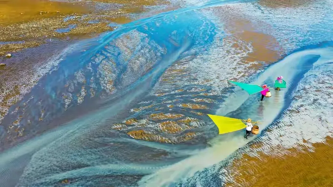 山崖边的视野开阔,拍出来比油画还美的七彩滩涂。这里最有名就是虎皮祥的滩涂斑纹和满滩满海的竿影、人影、船影。波光粼粼的大海,远山岛屿浑然一体。