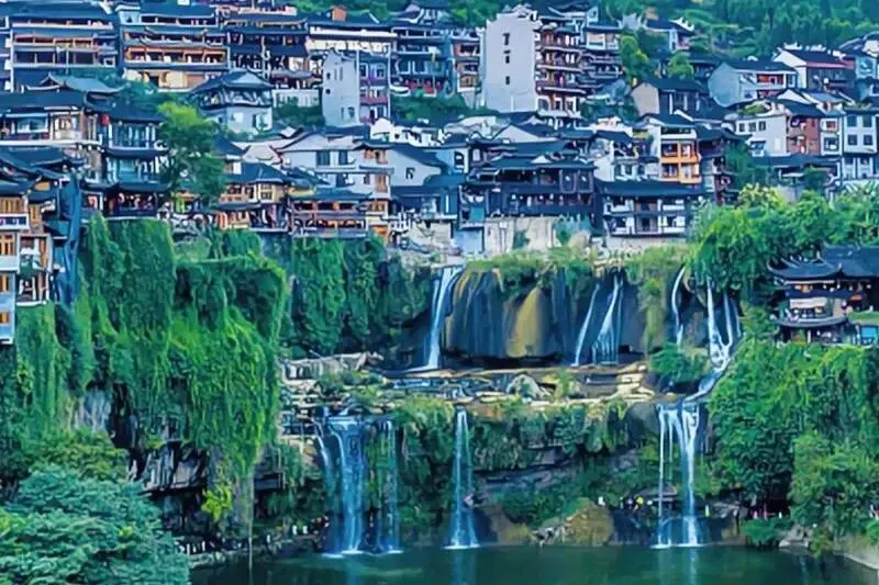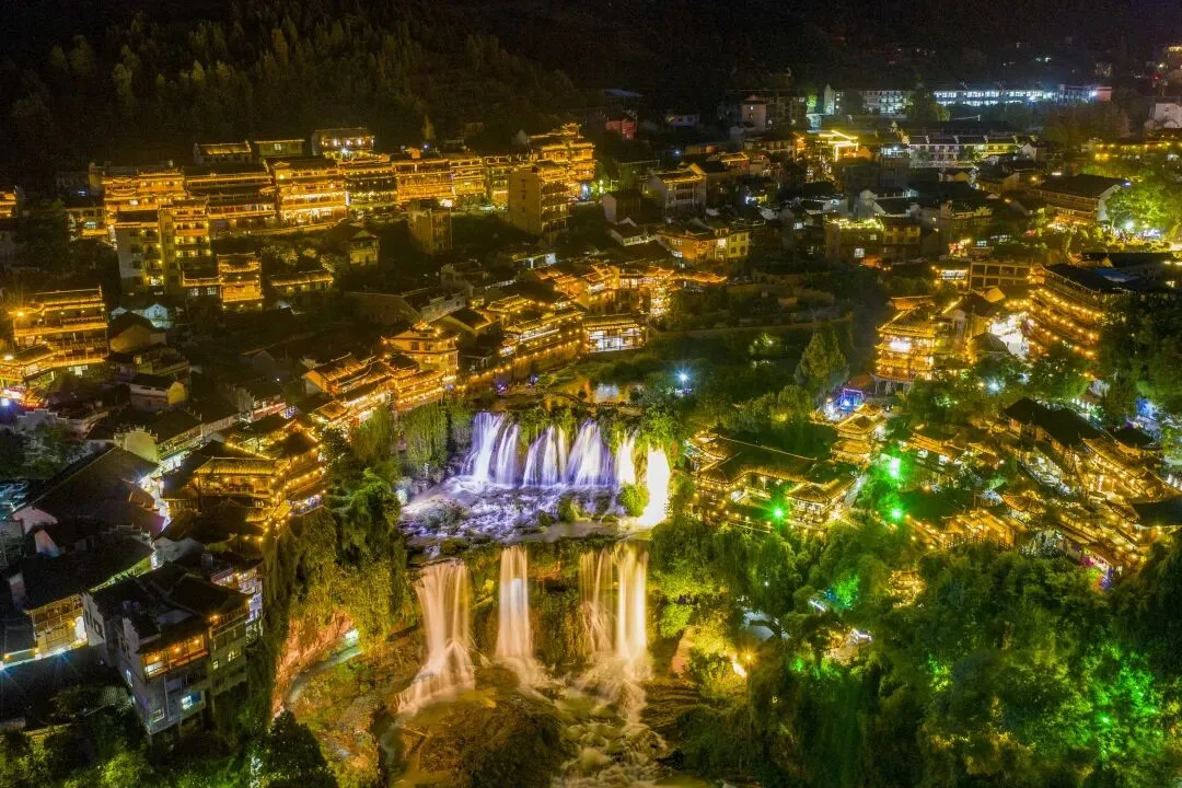 简介:“挂在瀑布上的千年古镇”!穿土王行宫隧道,站在瀑布下方感受水帘洞的清凉,夜晚灯光秀将吊脚楼染成七彩仙境。