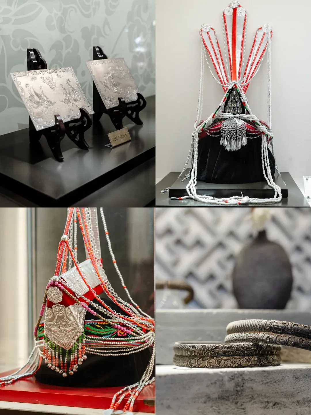 •馆内陈列着精美的畲族银饰,展示了畲银文化的发展历程和工艺特点,畲族崇凤敬女,里面大多银饰品都和凤凰有关。