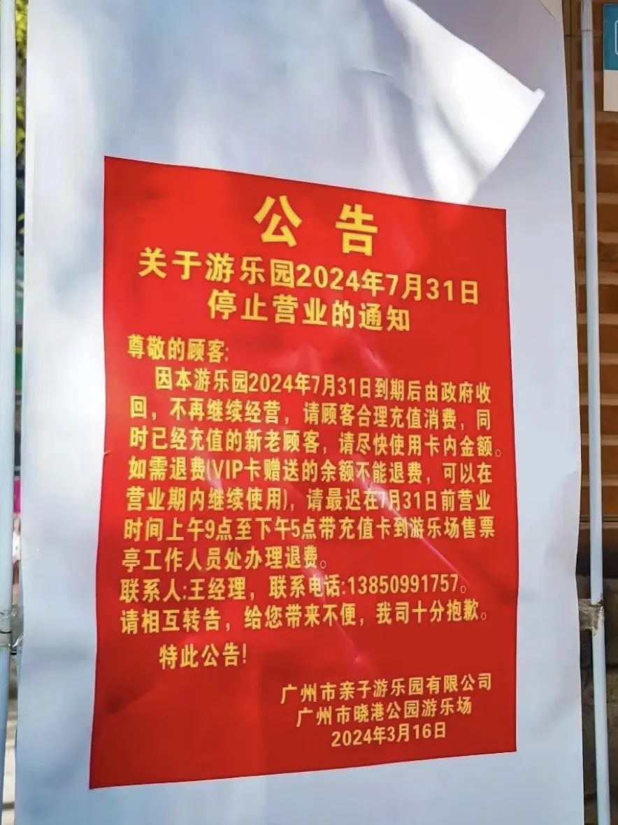 近日,广州海珠区晓港公园游乐场宣布将于7月31日停止营业,结束23年的运营历史。 公告提醒,已经充值的新老顾客,请尽快使用卡内金额。如需退费(VIP卡赠送的余额不能退费,可以在营业期内继续使用),最迟在7月31日前营业时间上午9点至下午5点带充值卡到游乐场售票亭工作人员处办理退费。