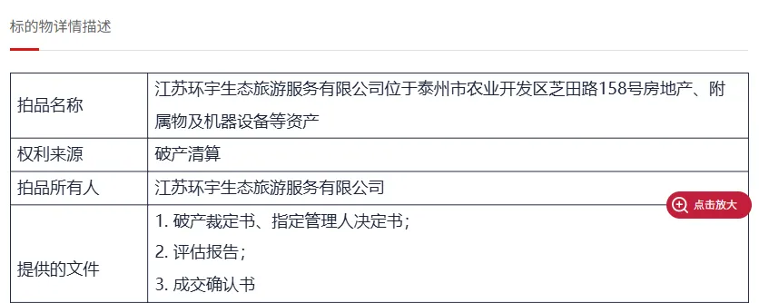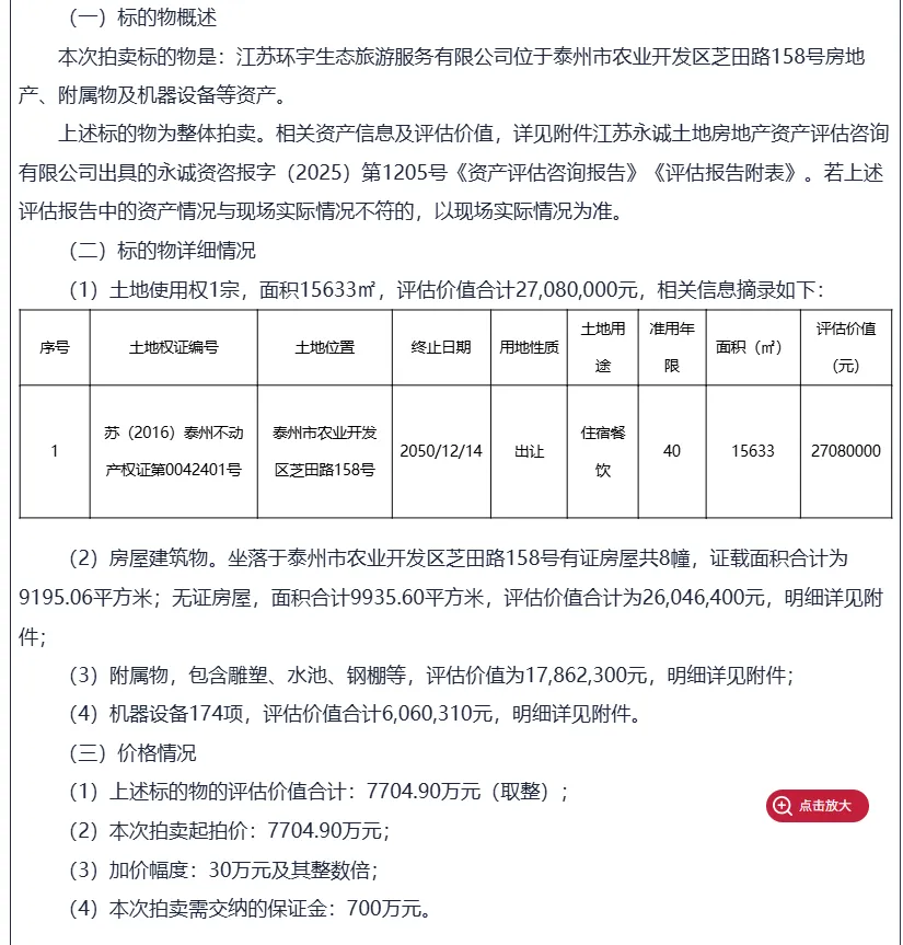 近日,在阿里法拍看到,江苏环宇生态旅游服务有限公司位于泰州市农业开发区芝田路158号房地产、附属物及机器设备等资产将在2026年1月24公开拍卖,起拍价约7705万元。