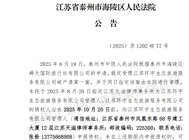 据悉,2025年6月19日,泰州市中级人民法院根据泰州市海陵区舜天国际旅行社有限公司的申请,裁定受理江苏环宇生态旅游服务有限公司破产清算一案,并于同日指定该案由泰州市海陵区人民法院进行审理。泰州市海陵区人民法院于2025年8月20日指定江苏天滋律师事务所为环宇公司管理人。