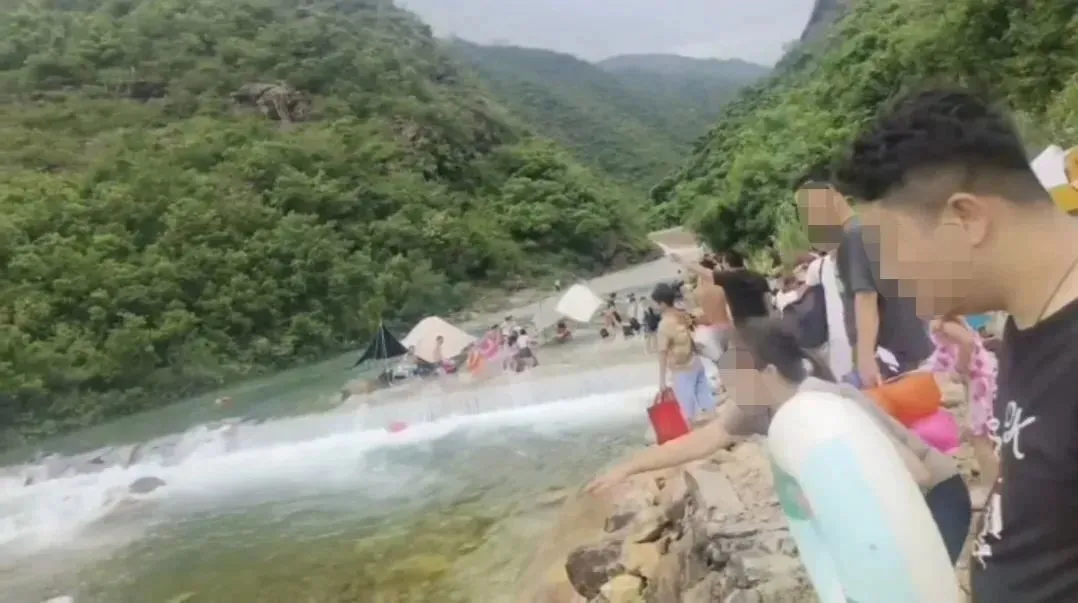 从一段网传视频看,这段河道两岸都是山,河水清澈,还有人在河中间搭起了帐篷。视频中能看到上游浑浊的山洪袭来,大部分人都在向河岸边转移,有大人抱着孩子向岸边走,河里来不及收的帐篷和游泳圈等物品被大水冲走。