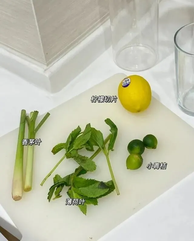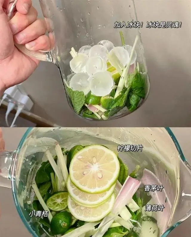香茅叶、小青桔、薄荷叶、柠檬、冰块。