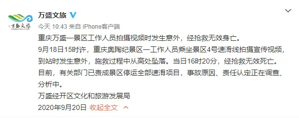 9月20日,重庆市万盛经济技术开发区文化和旅游发展局官方微博发布通报,重庆万盛一景区工作人员拍摄视频时发生意外,经抢救无效身亡。