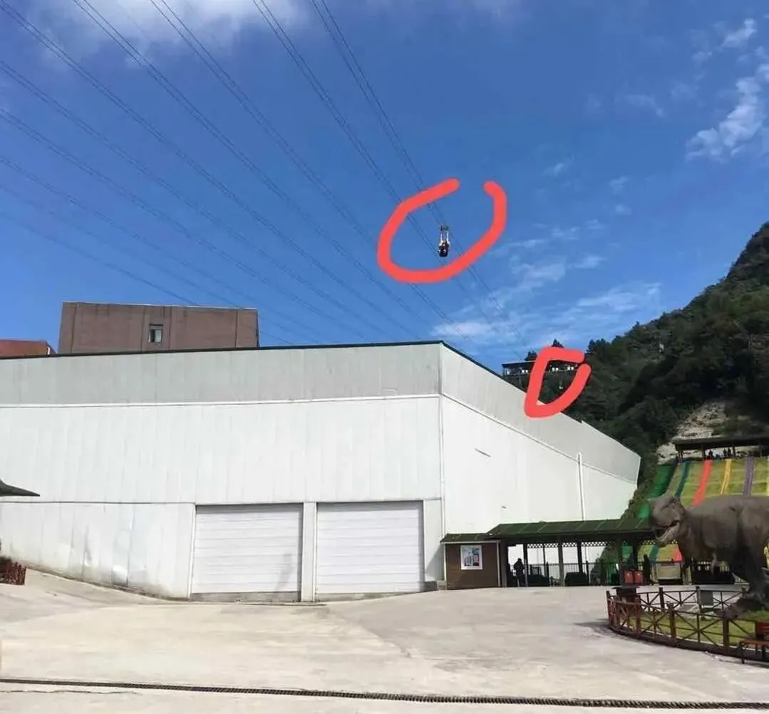 ▲重庆万盛奥陶纪公园,女子被困高空索道中央。图据微博