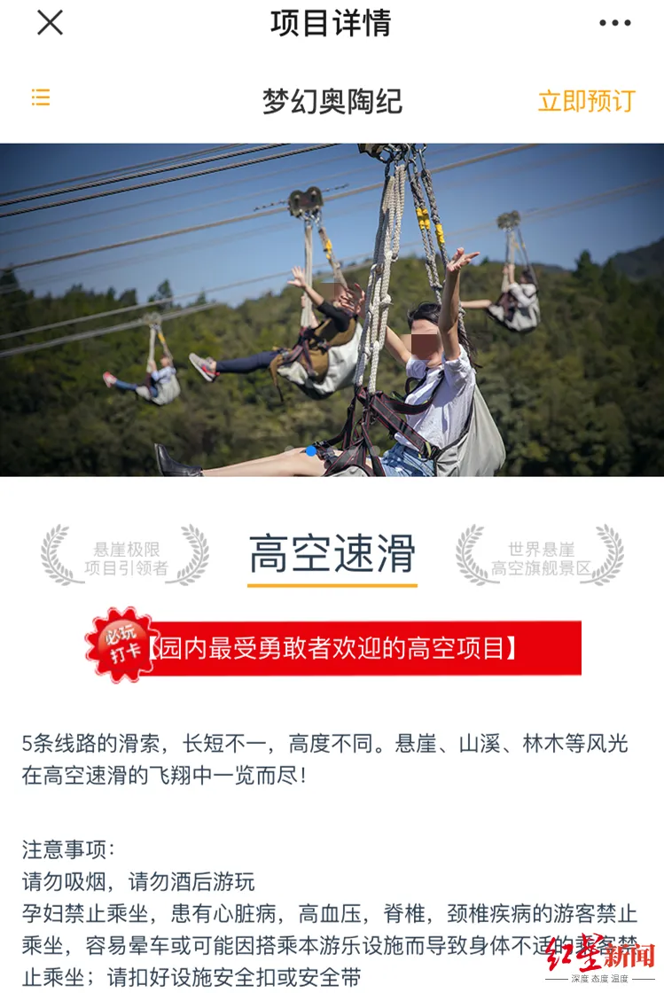▲园方对高空速滑项目的介绍。截图自梦幻奥陶纪微信公众号 天眼查显示,重庆奥陶纪旅业有限公司曾因违反《中华人民共和国安全生产法》相关规定遭到行政处罚。 据此前报道,2018年10月1日,一段“游客在奥陶纪景区极限飞跃项目游玩时保险扣突然脱落”的短视频在网上传播,引发网友关注。经万盛经开区认真调查核实:因工作人员操作不当,导致游客背后保险绳保险扣脱落。