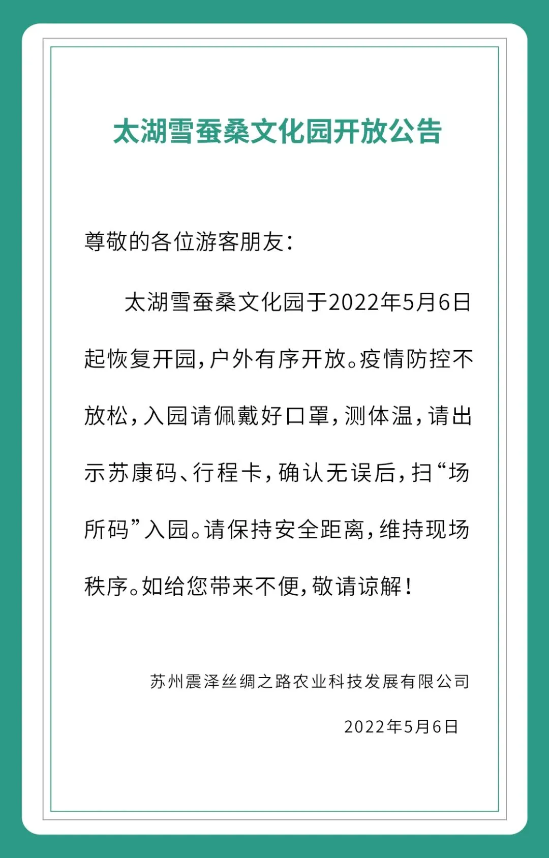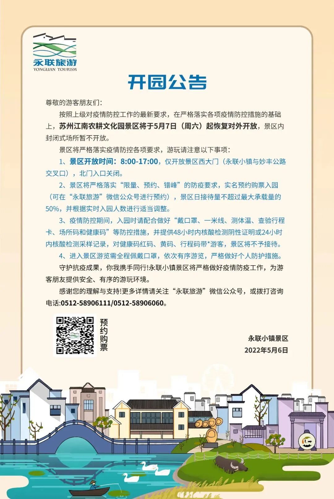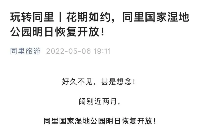 ①自2022年5月7日08:30时起,同里国家湿地公园将根据苏州市疫情防控要求,在做好各项准备工作的基础上恢复运营。