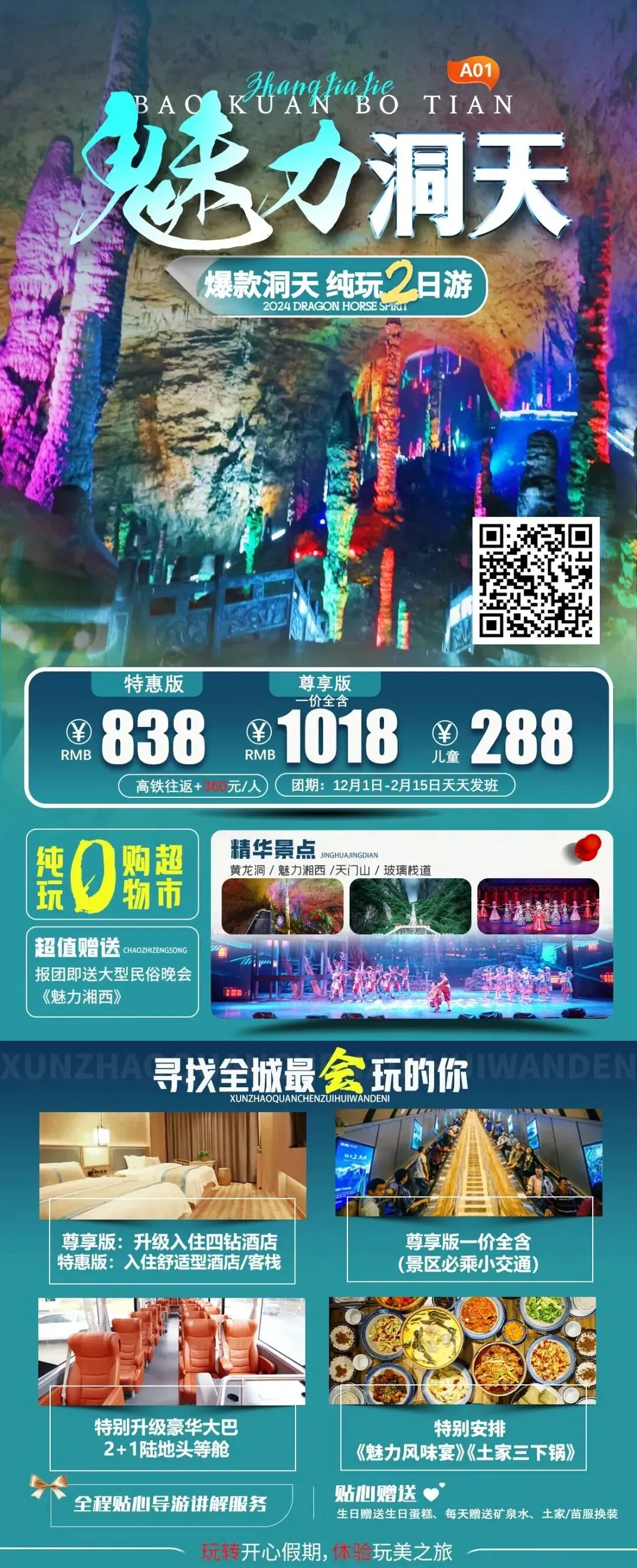 【魅力洞天|张家界两日旅游】湖南长沙出发:张家界黄龙洞+天门山(玻璃栈道)+赠送魅力湘西表演纯玩汽车2日游