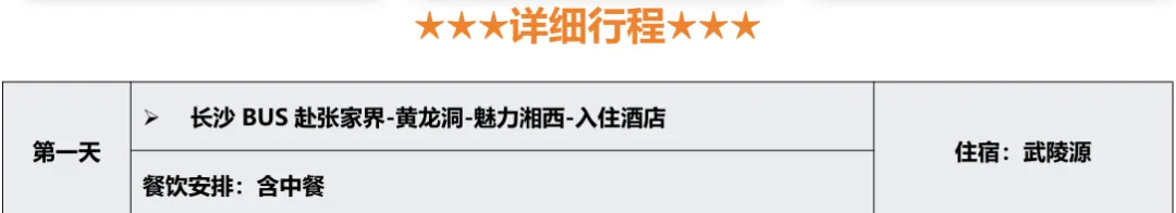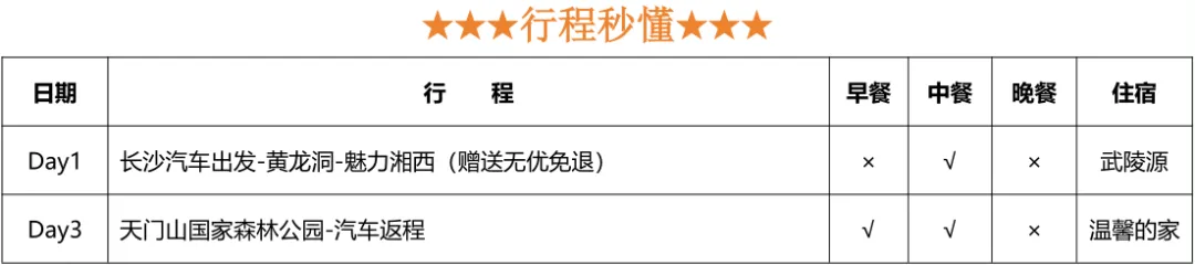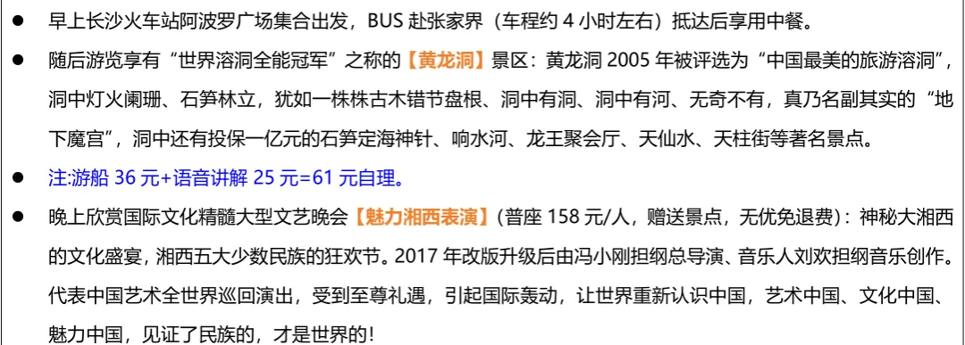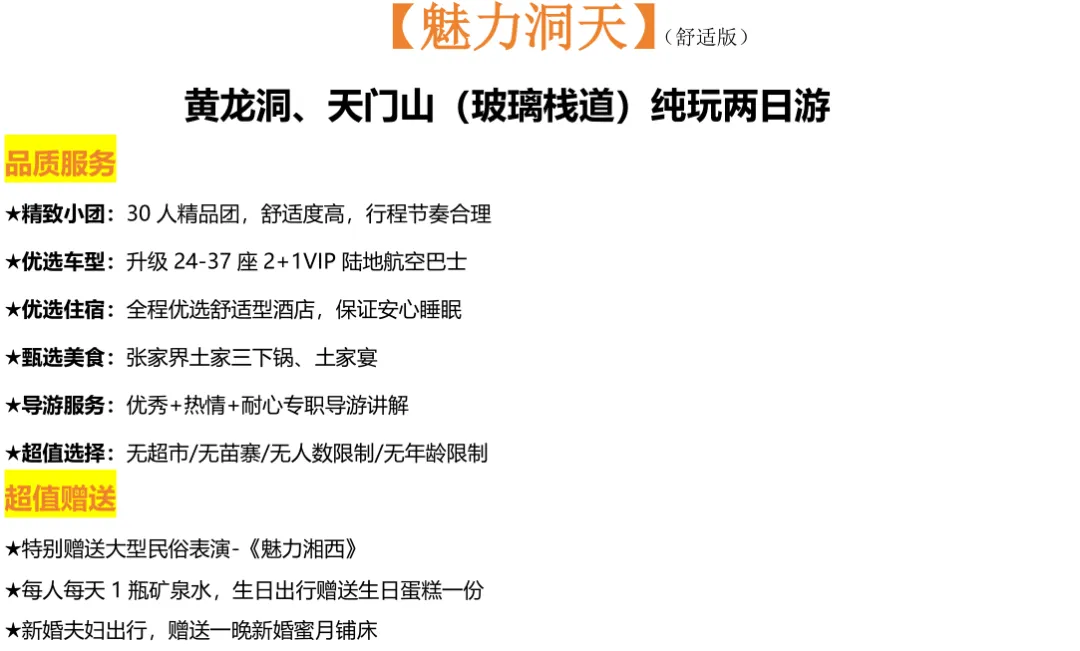 💛费用包含:往返车费+景区大门票+1晚住宿+1早餐2正餐+成人赠送魅力湘西表演+导游服务+保险