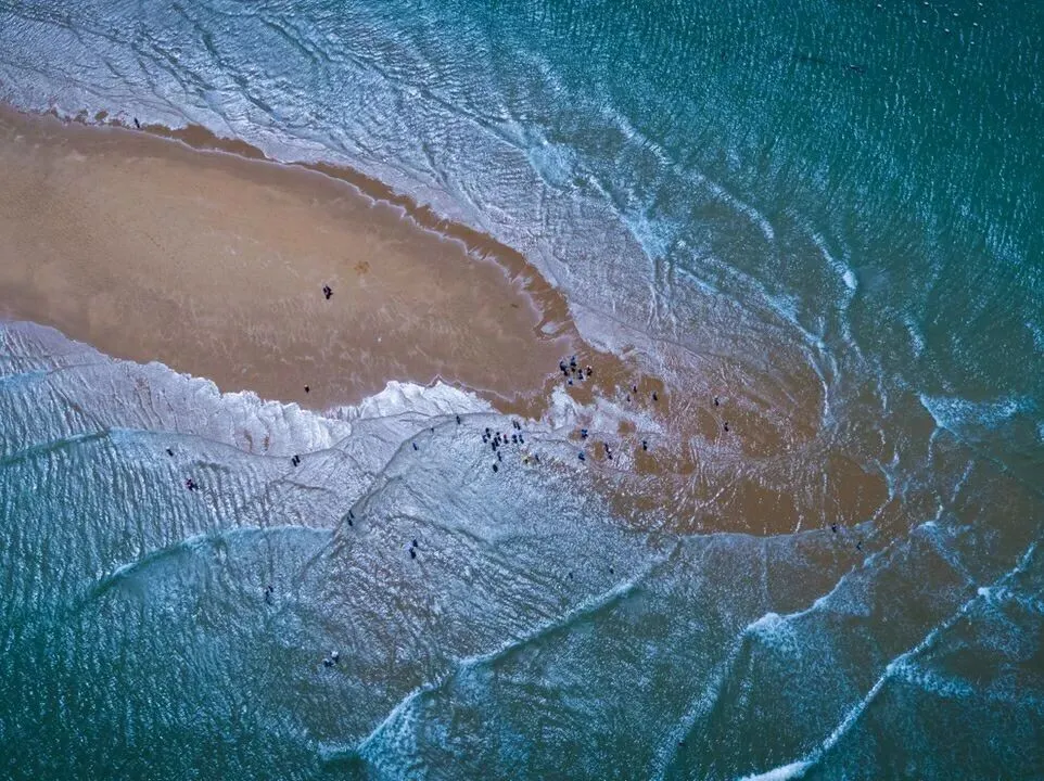 这是大海中的一片浅滩,退潮后露出水面的部分形状如同鱼骨,因而得名。涨潮的时候站在沙洲里,“就像在茫茫大海中漂流”。 在航拍中,鱼骨沙洲是这样的: