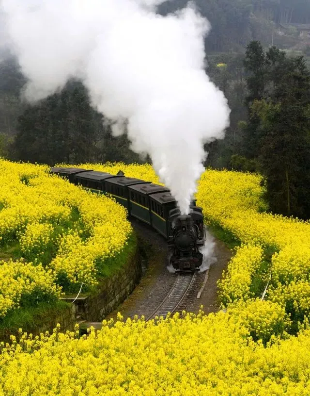 油菜花盛开的季节,喷着白烟的小火车穿过花海——这张照片是80%游客来到这里的原因。 让我们将镜头拉远一些: