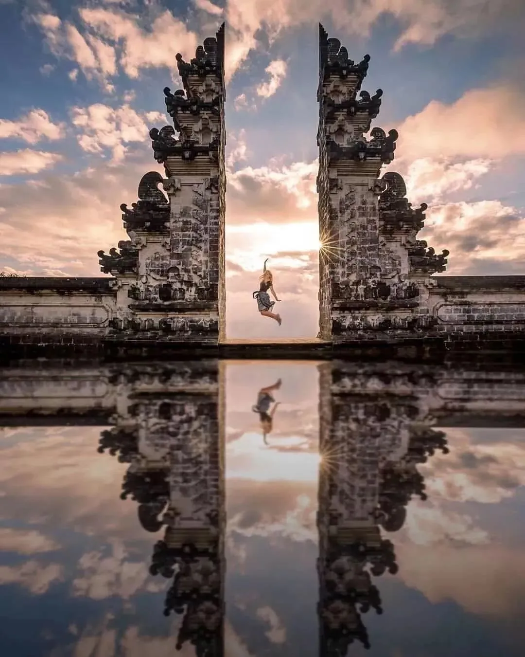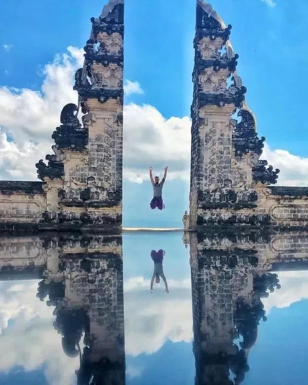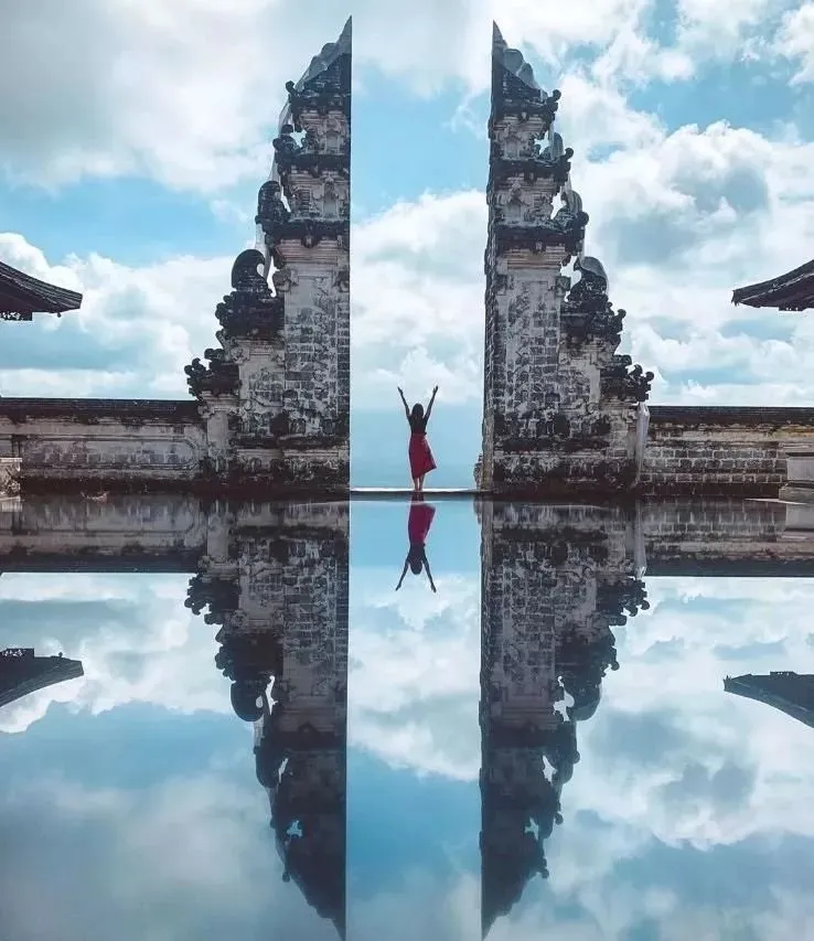 总有一些景点为摆拍而生 许多人费劲心机想要拍出一张完美的,如同镜面一般的“天空之镜”,却没有想到一点:与其努力拍的像镜子,不如直接拍镜子。 在巴厘岛最东部 pura lempuyang 寺庙群的第一座寺庙入口处,有一座世界级的网红景点“天空之门”。