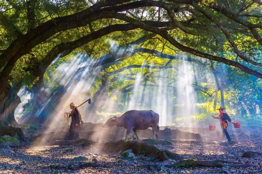 青烟袅袅,缕缕微光,一人一牛一树,快门一按,大功告成。