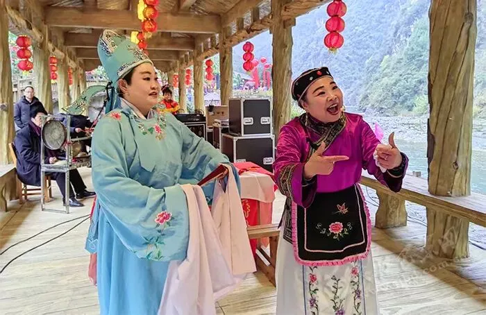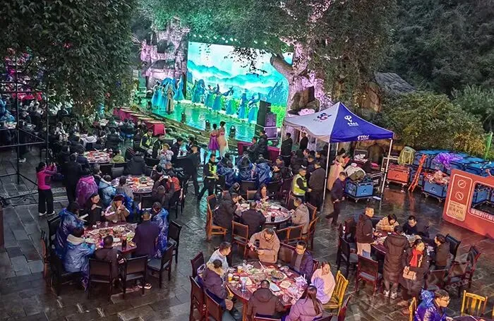 傍晚时分,游客广场上演的刨汤宴成为整场活动的重头戏。随着热气腾腾的排骨炖萝卜、豆豉炒肉、猪血、豆腐等特色汤锅、干锅、配菜依次上桌,瞬间勾起了众人的食欲。游客们围桌而坐,品尝地道风味。边吃刨汤,边看演出,堂戏、皮影戏等非遗节目和纤夫情舞台,演员们身着传统服饰,欢唱着土家歌舞,交相辉映,令人悦耳舒心。