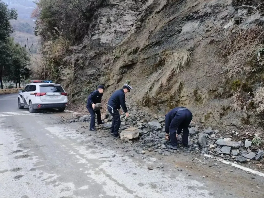 民辅警们手持铁锹、扫帚、砍刀等工具,分工协作清理路面。他们有的奋力铲除积雪,有的移开被雪压断的树枝,有的仔细捡拾散落碎石,并在危险路段设置临时警示标志。经过数小时连续奋战,主要通行路段积雪和障碍物基本清除,交通安全得到保障。派出所还在各路口增派警力,引导车辆缓慢通行,提醒游客注意防滑。