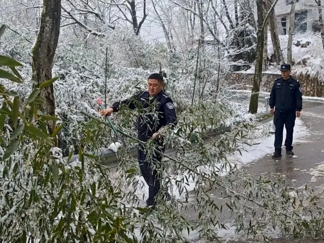 民辅警们手持铁锹、扫帚、砍刀等工具,分工协作清理路面。他们有的奋力铲除积雪,有的移开被雪压断的树枝,有的仔细捡拾散落碎石,并在危险路段设置临时警示标志。经过数小时连续奋战,主要通行路段积雪和障碍物基本清除,交通安全得到保障。派出所还在各路口增派警力,引导车辆缓慢通行,提醒游客注意防滑。
