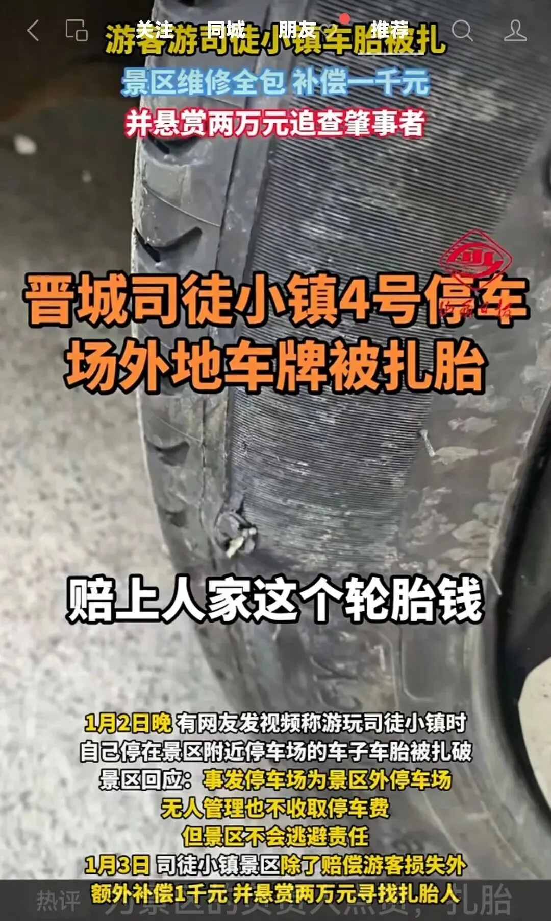 1月3日,山西晋城司徒小镇景区因一起"轮胎被扎"事件引发热议。1月2日晚,有游客发布视频称,其停放在景区附近停车场的车辆轮胎被扎破,质疑景区管理疏漏。而景区最初回应"停车场属外部区域,无人员管理不收费",一度被网友批评"甩锅"。然而仅隔一天,事件迎来戏剧性反转——景区不仅全额赔偿损失,还额外赔付1000元,并悬赏两万元寻找扎胎者。