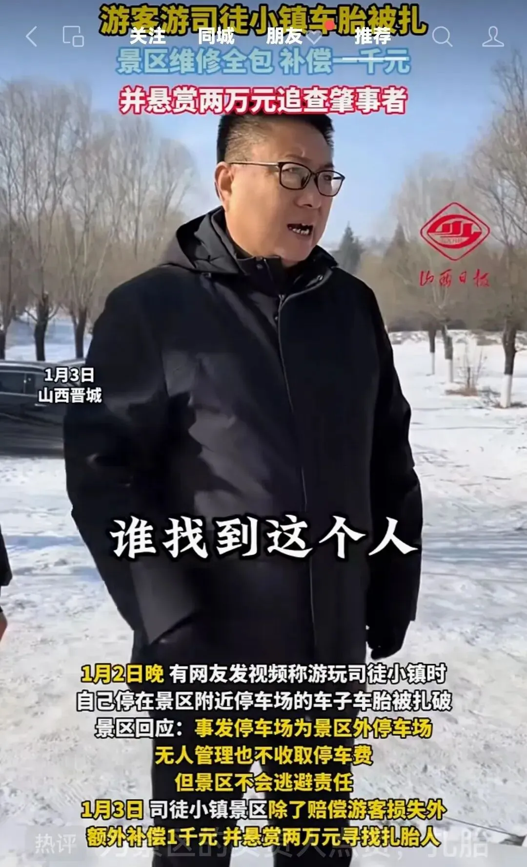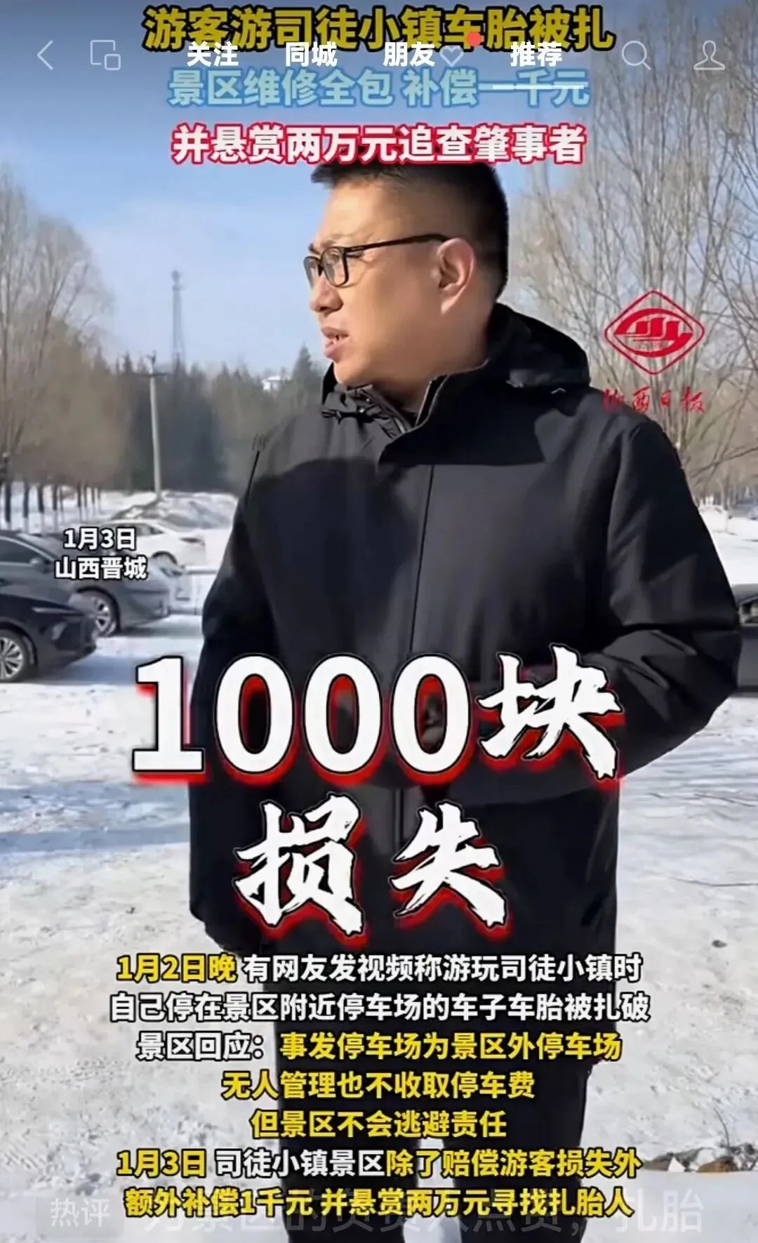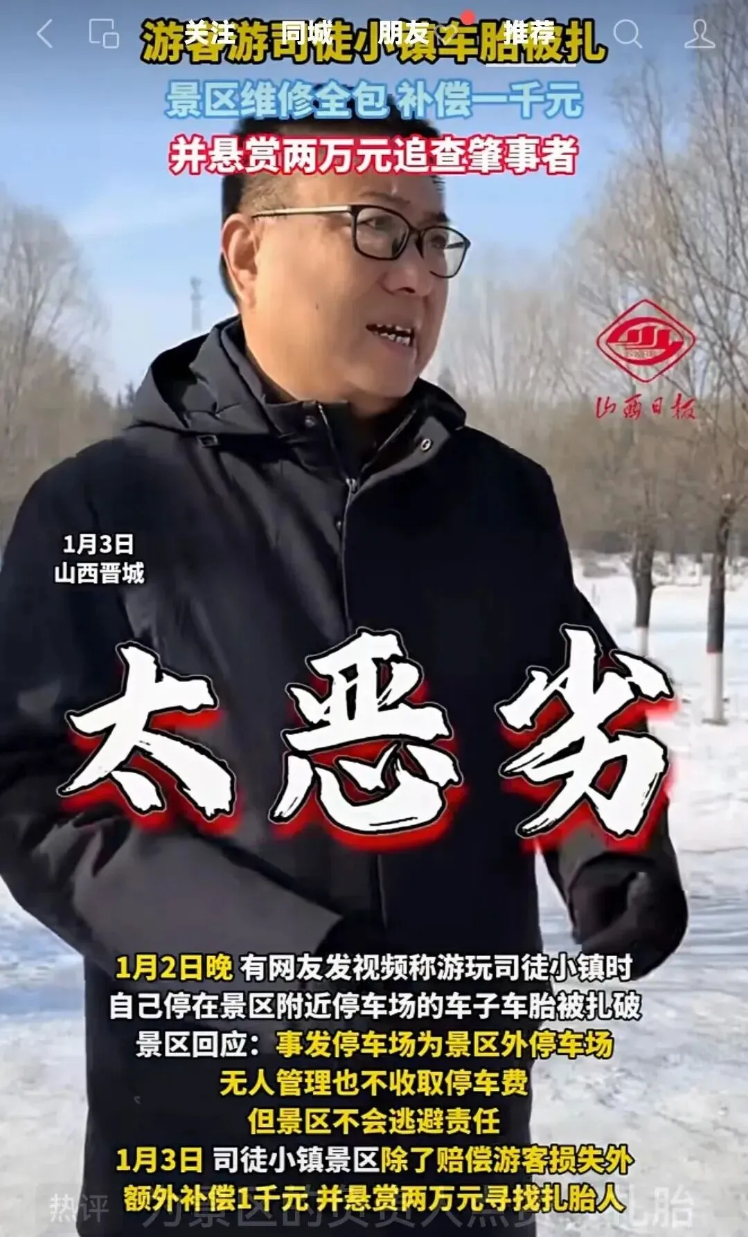 1月3日,山西晋城司徒小镇景区因一起"轮胎被扎"事件引发热议。1月2日晚,有游客发布视频称,其停放在景区附近停车场的车辆轮胎被扎破,质疑景区管理疏漏。而景区最初回应"停车场属外部区域,无人员管理不收费",一度被网友批评"甩锅"。然而仅隔一天,事件迎来戏剧性反转——景区不仅全额赔偿损失,还额外赔付1000元,并悬赏两万元寻找扎胎者。