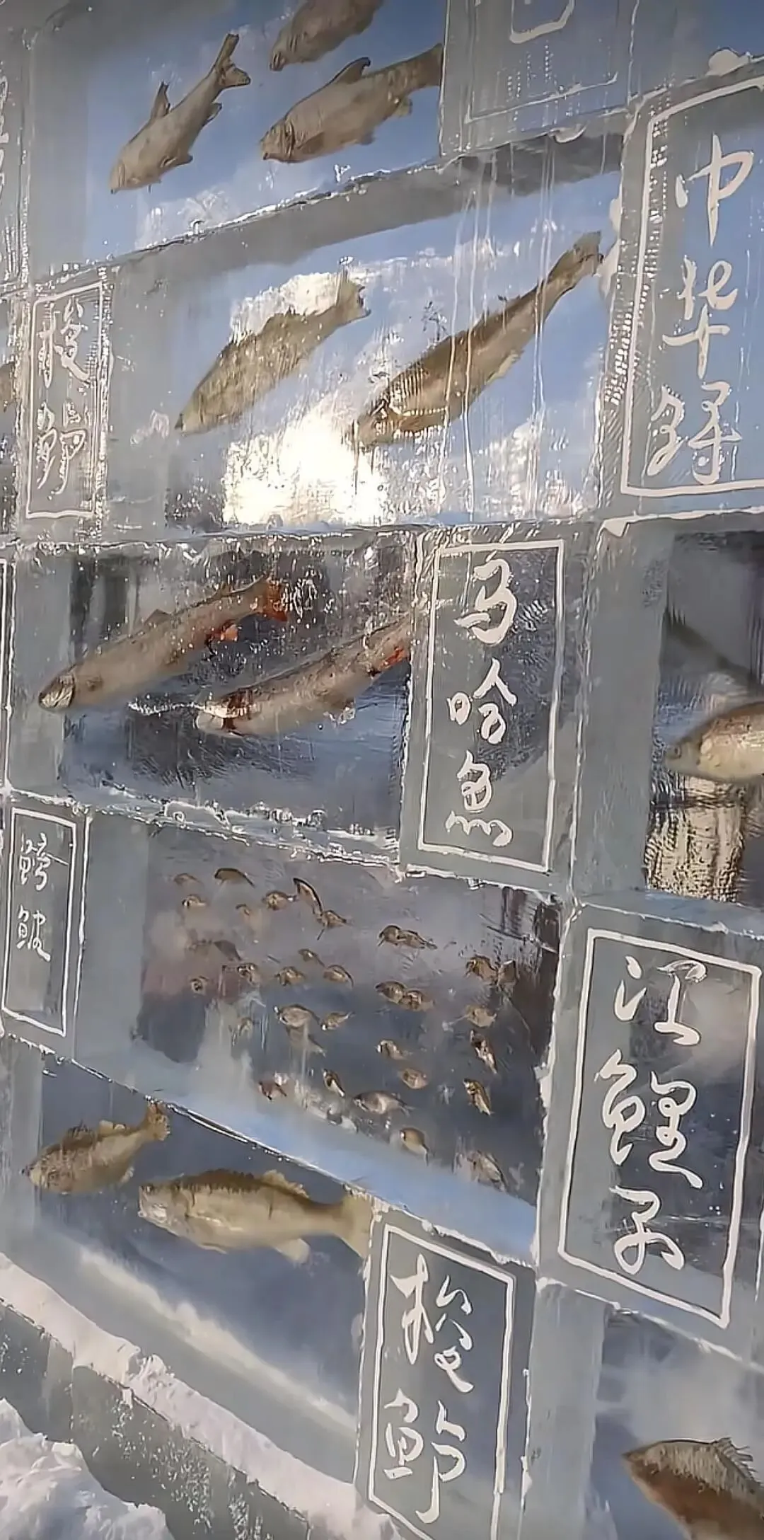 黑龙江三江口景区现3米高“冰封鱼墙”,中华鲟等20余种江鱼成“冰琥珀”,去年这些鱼展后还被竞拍