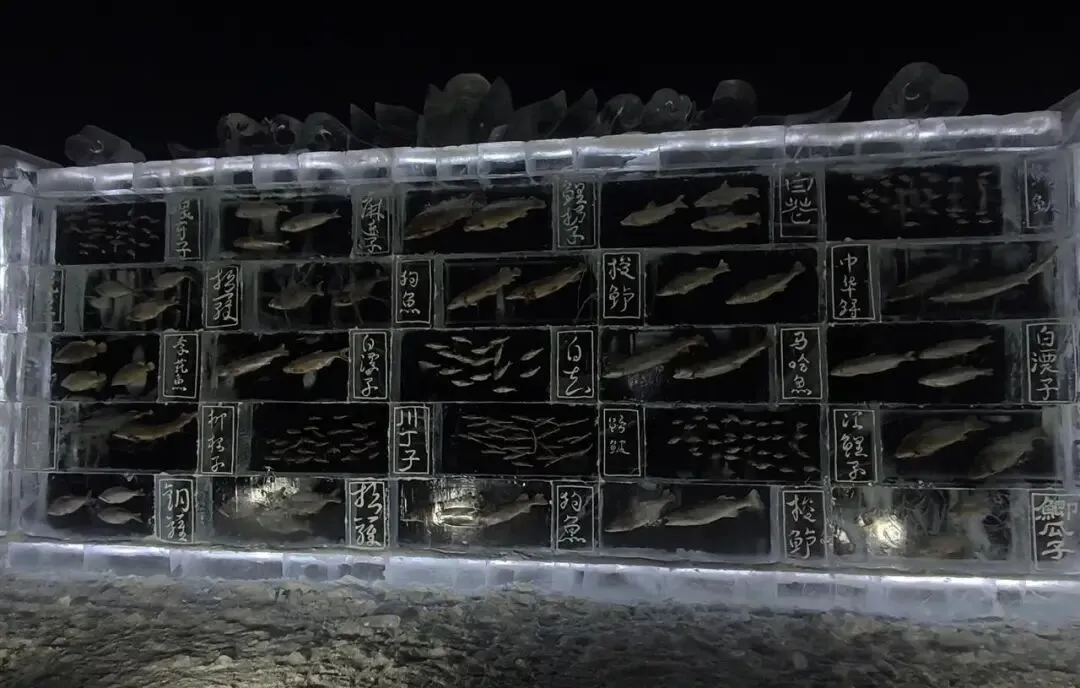 来自黑龙江同江市的王先生告诉记者,12月30日,他在同江市三江口生态旅游区游玩时,发现江边一处空地上有一面冰墙景观,墙壁内冻着不同品种的鱼类,一旁还有名字。王先生称,这些鱼类来自黑龙江和松花江,他第一次看到该景观,便随手拍了视频记录。