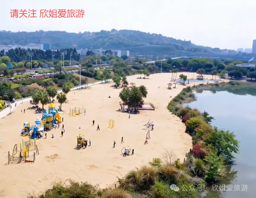 沙滩公园位于福州市闽江南岸,洪塘大桥两侧,西邻乌龙江,东连妙峰山,全长约3000米,宽度30—200米,总面积约450亩。分为休憩区、沙滩区、戏水区、游乐区、生态区等功能区。沙滩区面积约3.2万平方米,沙子来自福建平潭;戏水区设浅水区和深水区,配备水上滑梯、水上秋千等设施。种植200多种植物,包括榕树、樟树、柳树等乡土树种和三角梅、紫薇等观赏花卉。有“洪塘古渡”景观区,依托金山寺建筑;“闽水情怀”文化长廊,通过雕塑、壁画展示闽江文化和福州历史。