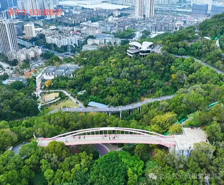 金鸡山公园位于福州市晋安区金鸡山麓,总占地面积约110公顷。《闽中记》载“秦始皇时,望气者云:此山有金鸡之祥”,故名金鸡山。山顶有明代“栖云庵”,山下有唐代“金鸡寺”和“地藏寺”;邻近有桑溪、曲水、荔枝林诸景。公园内有南天照天君宫、叠石飞瀑、大成亭、望城亭、望景台(观晋台)、飞虹桥、魏杰故居、红业台、梅花林、人大樱花林、桃花坡、栖霞台、虎眺台、松林台、银杏广场等景点。飞虹桥是连接南北区的钢构悬索桥,全长近百米;魏杰故居经过修复,内部展陈通过全息投影重现清代诗人著书立说场景。
