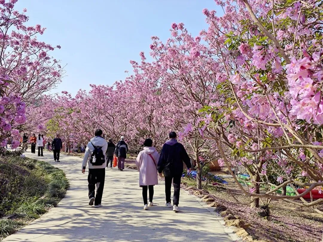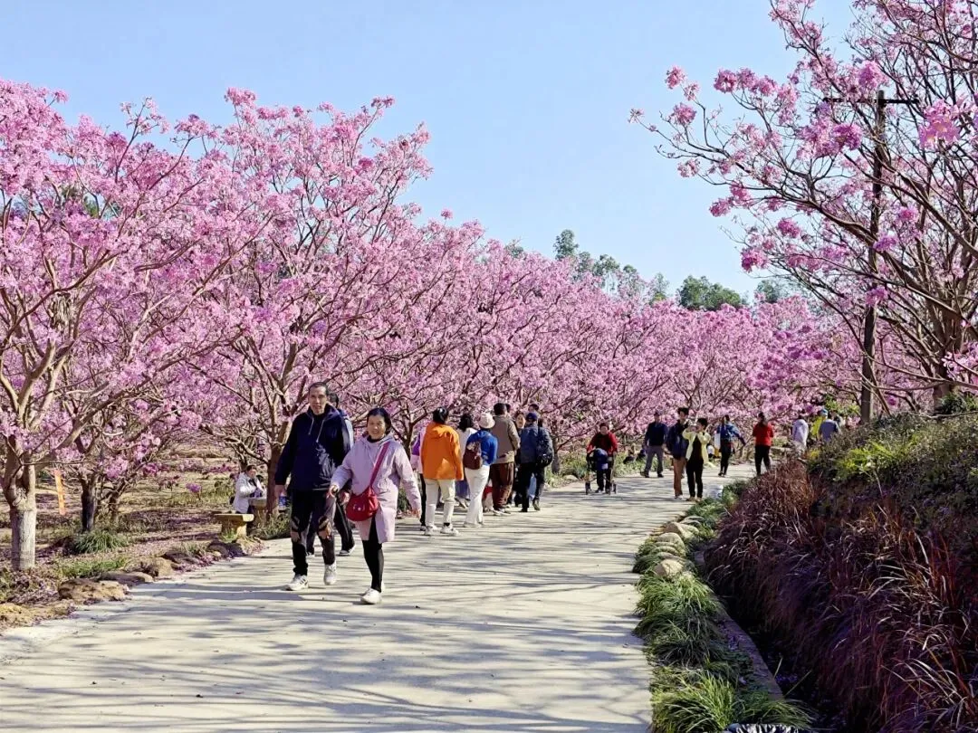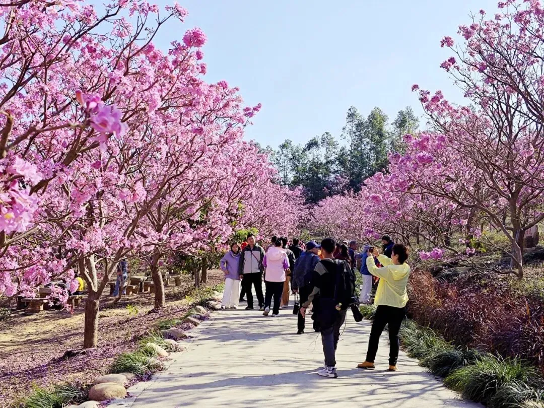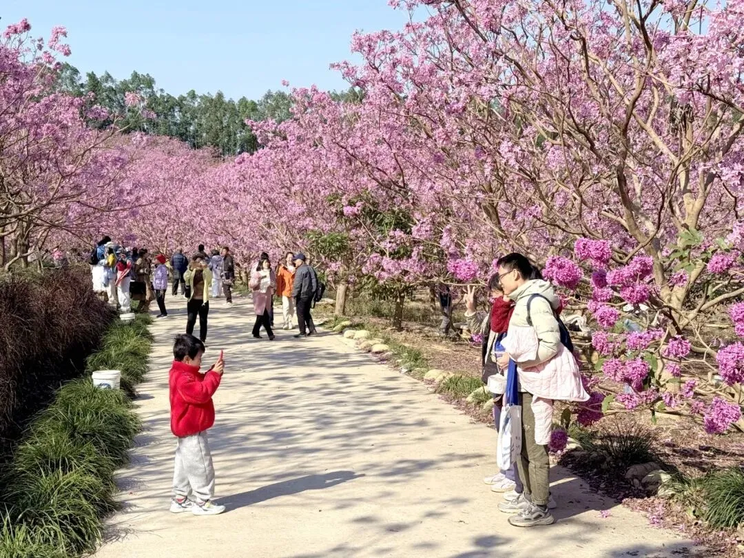 元旦假期,位于新会大泽的绿美生态园以灿烂的紫花风铃木花海吸引广大游客,迎来游览热潮。生态园所种植的6000株紫花风铃木正值盛花期,粉紫色花海宛如冬日里的绚丽画卷,在山坡上徐徐铺展。