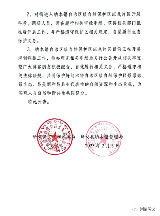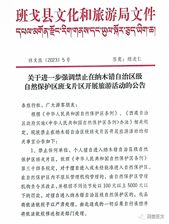 昨日(4日),“网信班戈”发布《关于进一步强调禁止在纳木错自治区级自然保护区班戈片区开展旅游活动的公告》。 根据《中华人民共和国自然保护区条例》《西藏自治区政府实施<中华人民共和国自然保护区条例>办法》相关规定,现就禁止在纳木错自治区级班戈片区开展旅游活动的相关事宜公告如下: 1、禁止任何单位、个人擅自进入纳木错自治区级自然保护区班戈片区,依照《中华人民共和国自然保护区条例》第三十四条规定,对于擅自进入或未经批准进入自然保护区、在自然保护区内不服从管理机构管理的,由自然保护区管理机构责令其改正,并根据不同情节处以 100元以上5000元以下的罚款。对擅自进入纳木错自治区级自然保护区的,我县将依法依规予以严肃处理,由此造成的一切后果自行承担并将依法依规移送相关部门处理。 2、对需进入纳木错自治区级自然保护区班戈片区开展科考、调研人员,须在履行相关审批手续、获得相关部门批准后开展工作,并严格遵守保护区相关规定,自觉履行生态保护义务。 3、纳木错自治区级自然保护区班戈片区目前正在开展规划调整工作,待办理完相关手续后另行公告开放相关事宜。望广大游客朋友积极配合,自觉履行相关义务,严格遵守相关法律法规,共同保护好纳木错自治区级自然保护区最原始、最生态、最美丽和最具有代表性的自然资源和生态景观,为实现人与自然和谐共生共同努力。