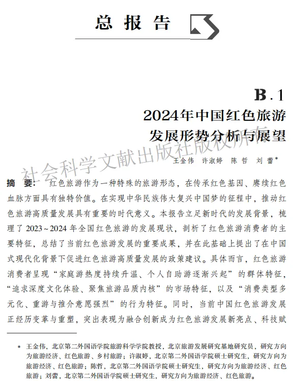 北京第二外国语学院旅游科学学院教授,北京旅游发展研究基地研究员,中国旅游政策研究中心主任王金伟等以《2024年中国红色旅游发展形势分析与展望》为题撰写总报告。
