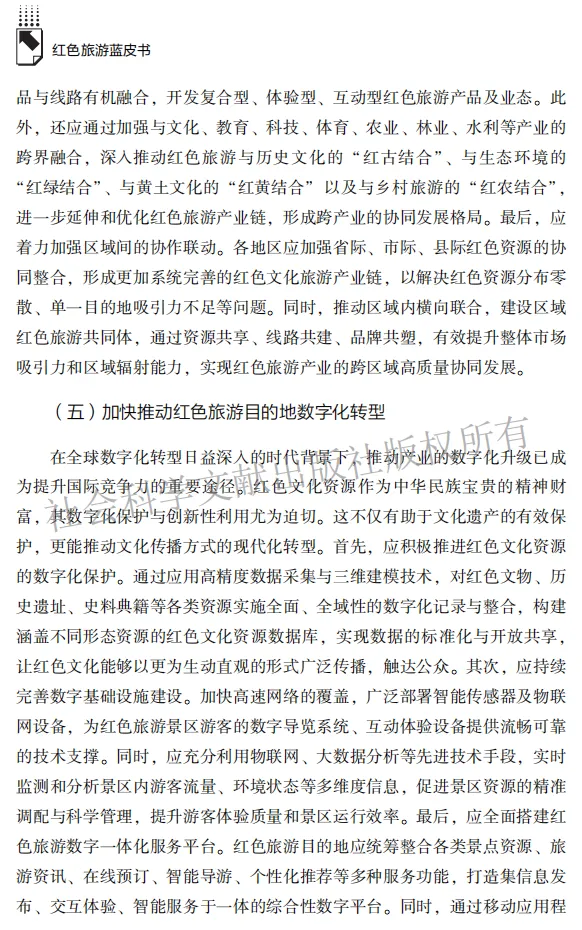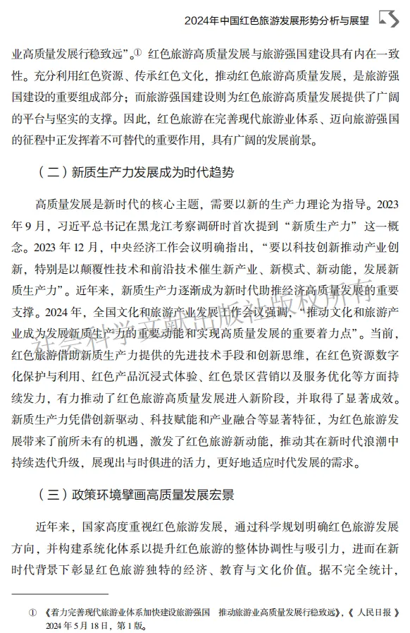 《中国红色旅游发展报告(2024)》以党的二十大精神为引领,聚焦推进中国式现代化的时代任务,系统阐释红色旅游在新时代所展现的独特价值和深层意义。红色旅游不仅是传承红色基因、弘扬革命精神的重要阵地,也是连接红色文化与现代生活的时代桥梁。本书强调用整体统筹、资源整合、产业协同等方式推进红色旅游高质量发展,倡导在保护中创新、在传承中融合,引导红色旅游更好地融入国家战略布局,在科技赋能、沉浸体验等方面不断探索。