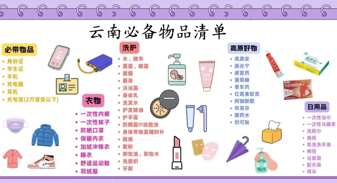 行李电话必备:证件(电子备份)、叠穿衣物、防晒套装、常用药 + 高反药、2 个充电宝、保湿品、雨具 / 防水鞋、高海拔区备正规氧气罐。