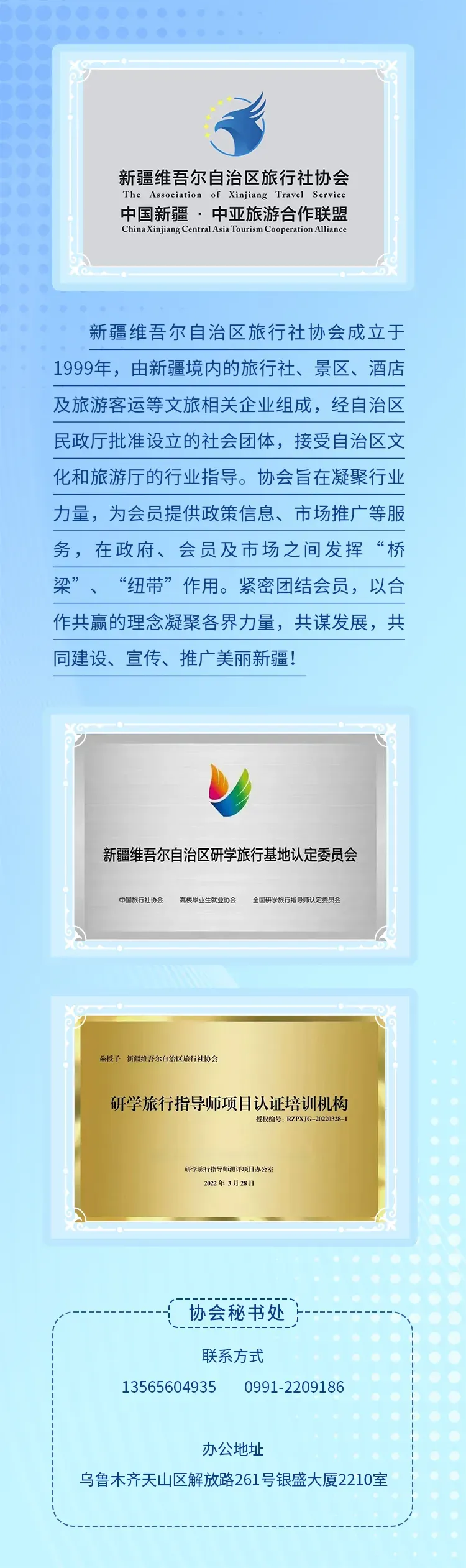 评优表彰 | 2025年度优秀会员单位 喜 报 | 2025新疆优秀旅行服务案例发布 全国·新疆旅行商大会丨专题报道(六)聚力共赢·活动总结 全国·新疆旅行商大会丨专题报道(五)和田段考察活动圆满结束——深入昆仑腹地 探寻和田魅力 全国·新疆旅行商大会丨专题报道(四)全国旅行商深度考察喀什、阿克陶、塔县等地,成果丰硕 全国·新疆旅行商大会丨专题报道(三)新疆旅行商大会欢迎晚宴暨协会年会——欢聚一堂 共叙情谊 全国·新疆旅行商大会丨专题报道(二)2025全国·新疆旅行商大会在喀什国际会展中心成功举办 全国·新疆旅行商大会丨专题报道(一)新疆文化旅游资源营销大会 协会动态丨柯坪旅游发展大会召开,柯坪携手协会搭建行业文旅合作平台 行业盛会丨2025全国·新疆旅行商大会即将在喀什启幕! 政策学习丨《关于进一步加强旅游市场综合监管的通知》——聚焦监管机制建设,推动旅游业高质量发展 联合发布丨关于落实未开发开放区域户外活动管理要求的通知 战略合作丨华住集团和协会战略合作暨业务交流会成功举行 通 知 | 关于组建协会专家委员会的通知 通 知 | 关于组建协会顾问团的通知 重要声明|关于本公众号公益性质及版权保护的声明