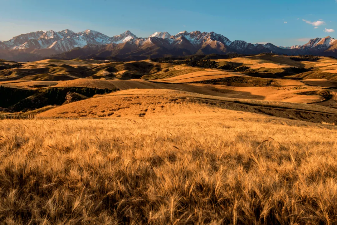 奇台县江布拉克景区秋季的金色麦田。