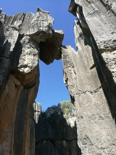 这样的奇景怎么能不大拍特拍?于是周边的游人纷纷拿出手机启动了照相模式,还有几位直接开上直播拍起了抖音视频。挤不到拍照的我们只好站在一旁,倒是有机会认真听了一下导游讲解这巨石的来历。原来石林里这样的悬空巨石景观不只一处,大部分都是在一次年代久远的地震中形成的。天崩地裂的地震中,石林一部分风化严重的高大石峰断裂了,巨大的石头砸下来,有的翻滚着落到地面,还有极少部分巨石非常巧合地落在了两块石峰中间,坚硬的岩石夹住了这飞来石,形成了神奇的“悬空石”,也就有了“千钧一发”这样巧夺天工的景观。这些“悬空石”看着惊险,实际上没有危害,它已经稳稳当当的在上面待了成百上千年,在未来的千百年里也会好好地悬在空中,为来石林观光的人们献上一个大大的惊喜。