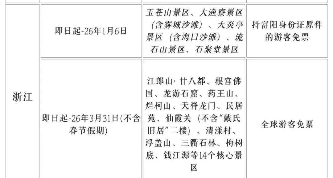 玉苍山景区、大渔寮景区(含雾城沙滩)、大炎亭景区(含海口沙滩)、流石山景区、石聚堂景区;江郎山·廿八都、根宫佛国、龙游石窟、药王山、烂柯山、天脊龙门、民居苑、仙霞关(不含“戴氏旧居”二楼)、清漾村、浮盖山、三衢石林、梅树底、钱江源等14个核心景区;东海灵岩景区,五彩姚庄,欢乐羊村
