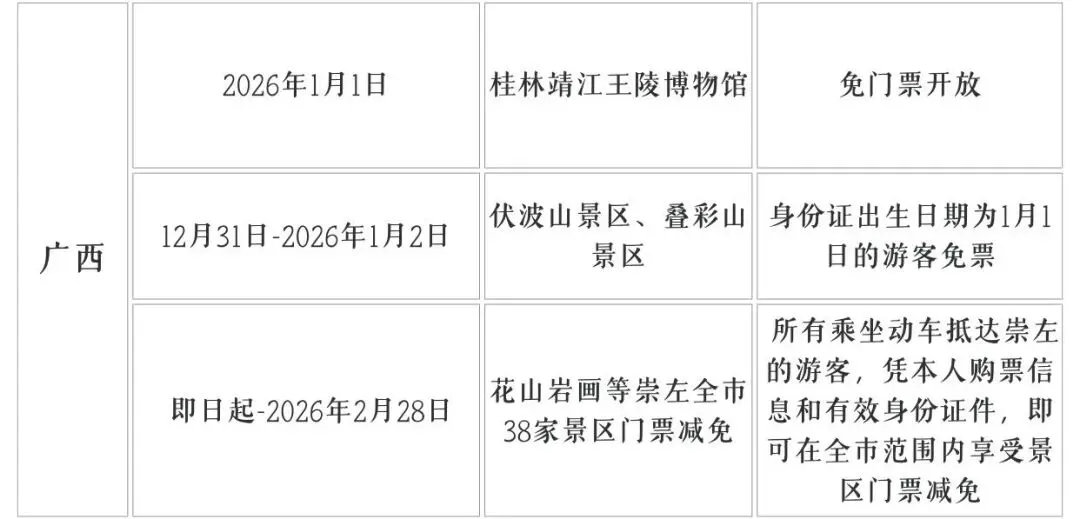 ✅免票景点:桂林靖江王博物馆、伏波山景区、叠彩山景区、花山岩画等崇左全市38家景区门票减免