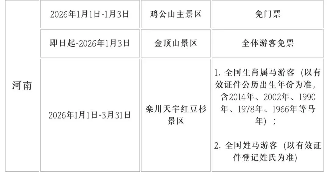 ✅免票时间: 鸡公山主景区,2026年1月1日 金顶山景区,即日起-2026年1月3日 栾川天宇红豆杉景区,2026年1月1日-3月31日 ✅免票条件: