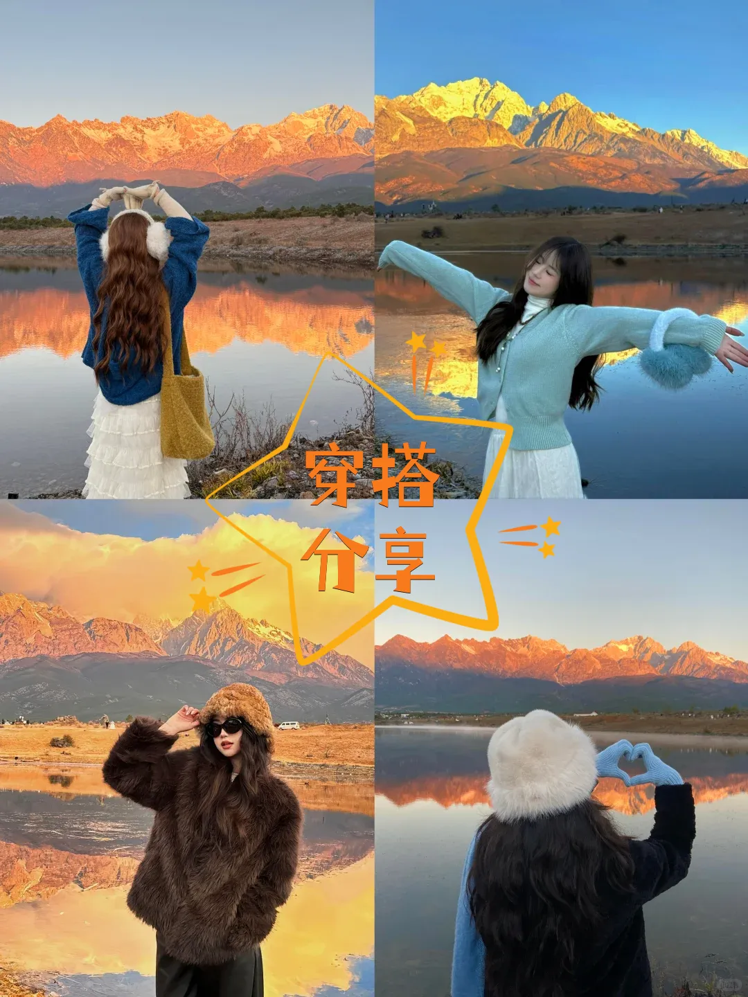 ✔️丽江冬季平均气温10-22℃,白天长袖衬衫或薄卫衣搭配长裤,简约舒适;晚上厚外套或薄羽绒服上