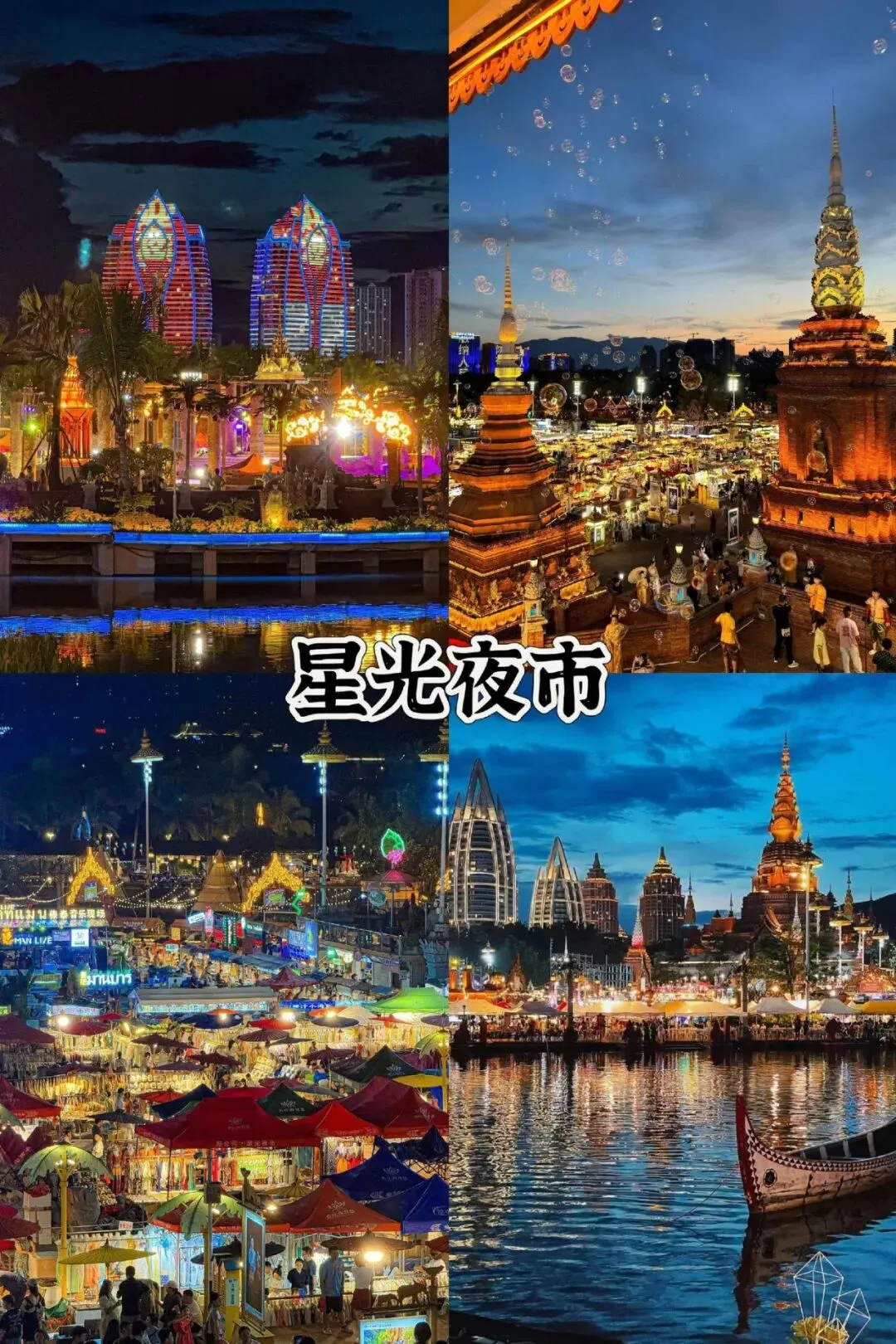 景点介绍:以东南亚风情为主题的商圈,核心包括星光夜市、景洪大金塔、六国水上市场。星光夜市是亚洲最大的露天夜市,万千灯笼点亮夜空,宛如星河,可品尝傣味小吃、选购手工艺品、体验傣装旅拍;大金塔建筑金碧辉煌,是告庄的标志性景观。