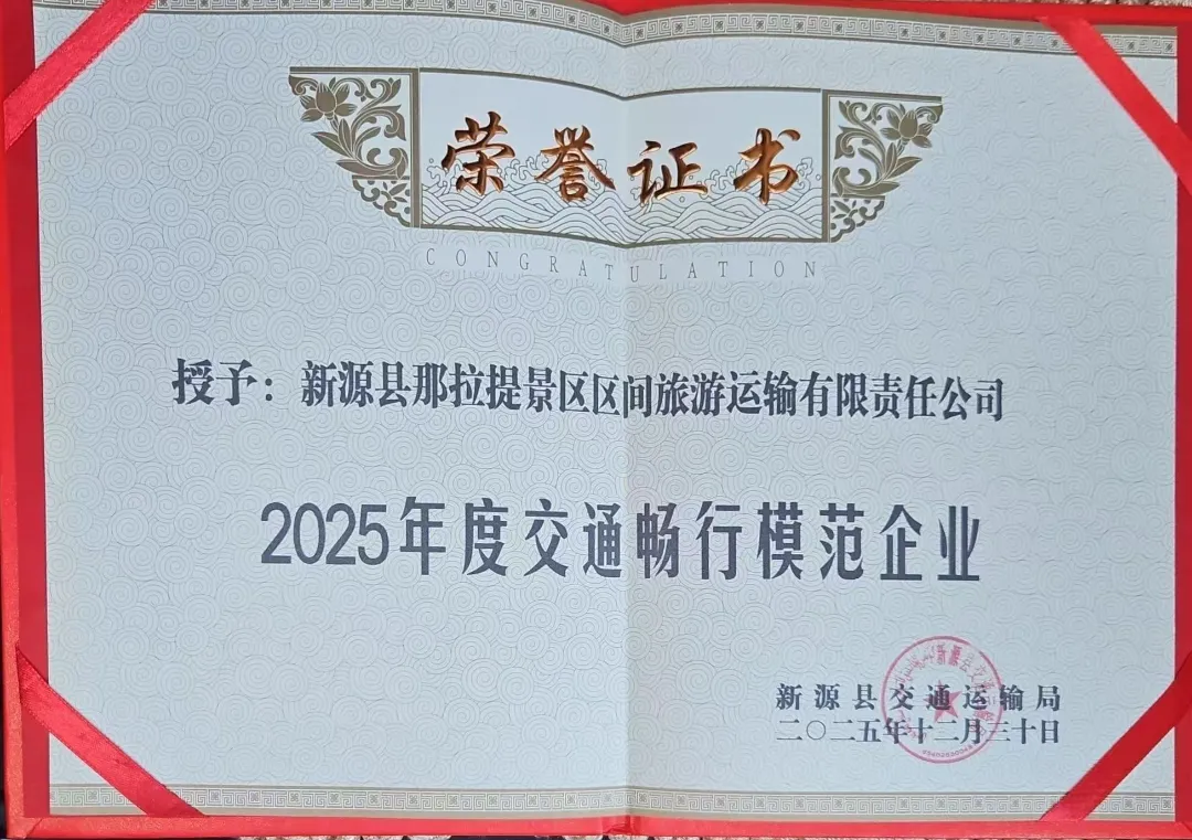 获评“2025年度交通畅行模范企业”荣誉,不仅是行业主管部门对那拉提景区运输公司2025年度安全生产与运营服务工作的认可,更是对新旅发展深耕文旅运输领域、坚守安全发展理念的肯定。下一步,那拉提景区运输公司将紧盯安全生产重点环节与关键领域,持续完善安全管理长效机制,不断优化运输服务流程,提升应急保障能力,以更高标准、更严要求、更优服务护航游客出行安全。