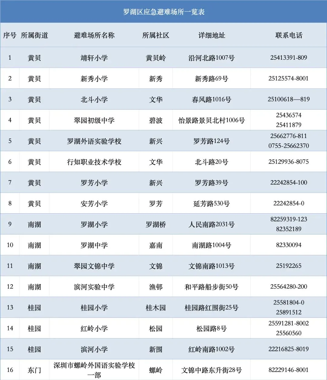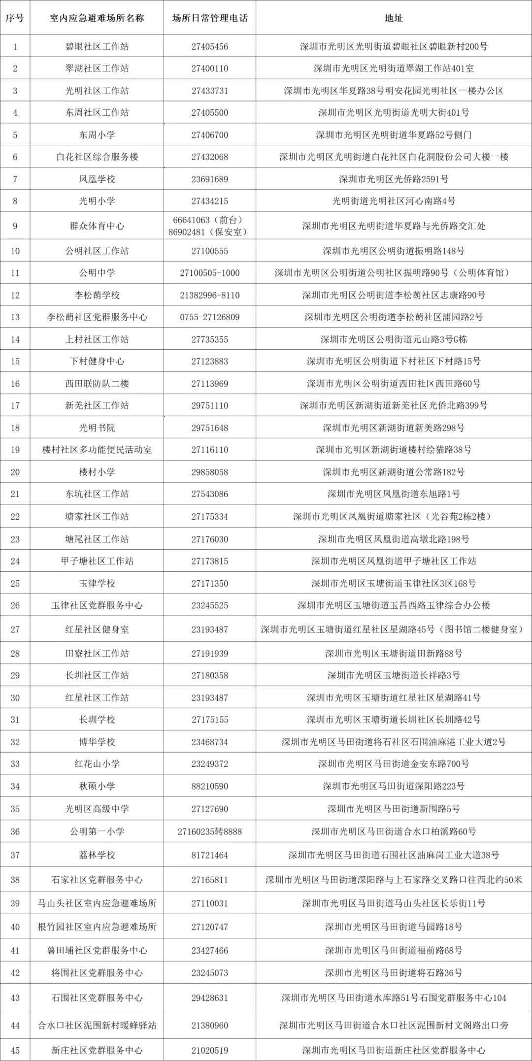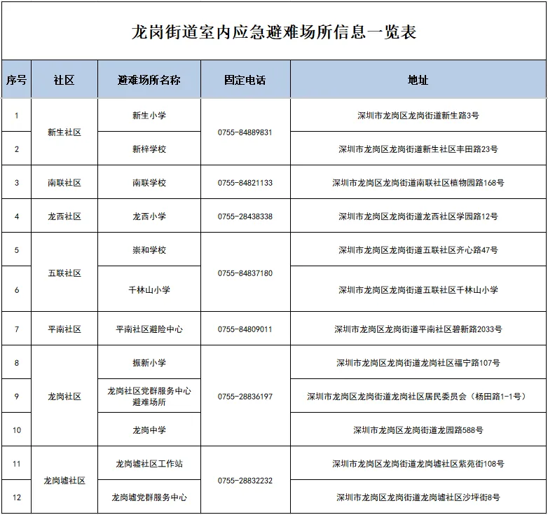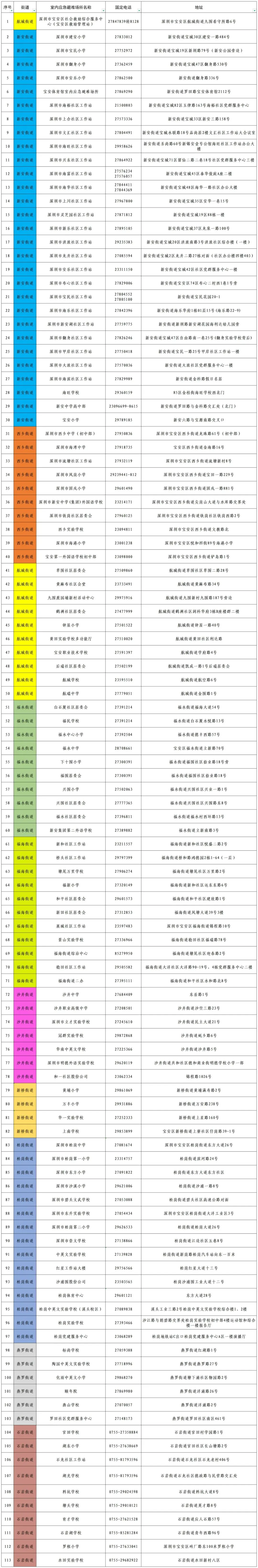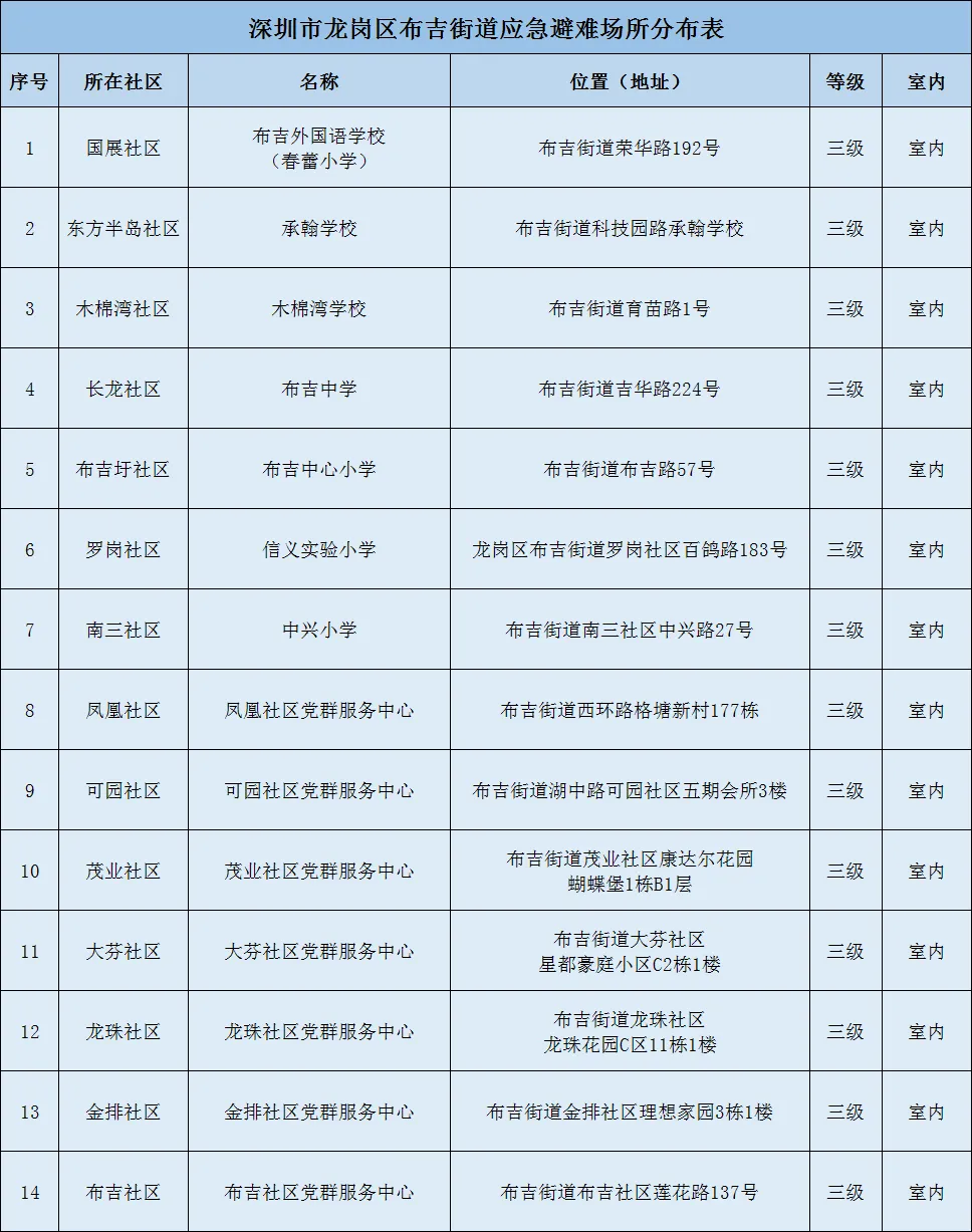 深圳目前已经公布的避难场所