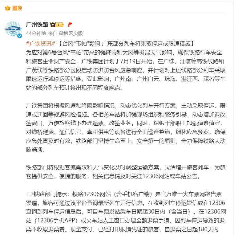 广东部分列车将采取停运或限速措施