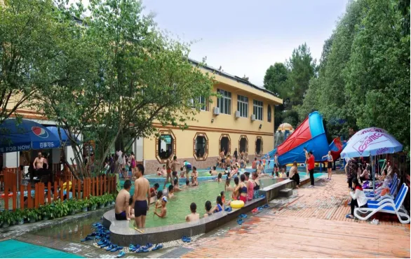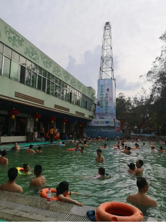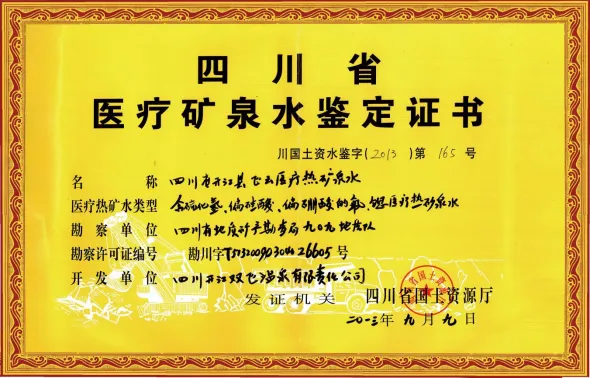 温泉井深2700米,水温48度,自溢到地面的医疗热矿泉水,泉水清澈碧透,“富含硫化氢、偏硅酸、偏硼酸的氟、锶,属医疗热矿泉水类型”,并获《四川省医疗矿泉水鉴定证书》。