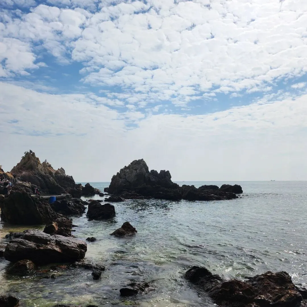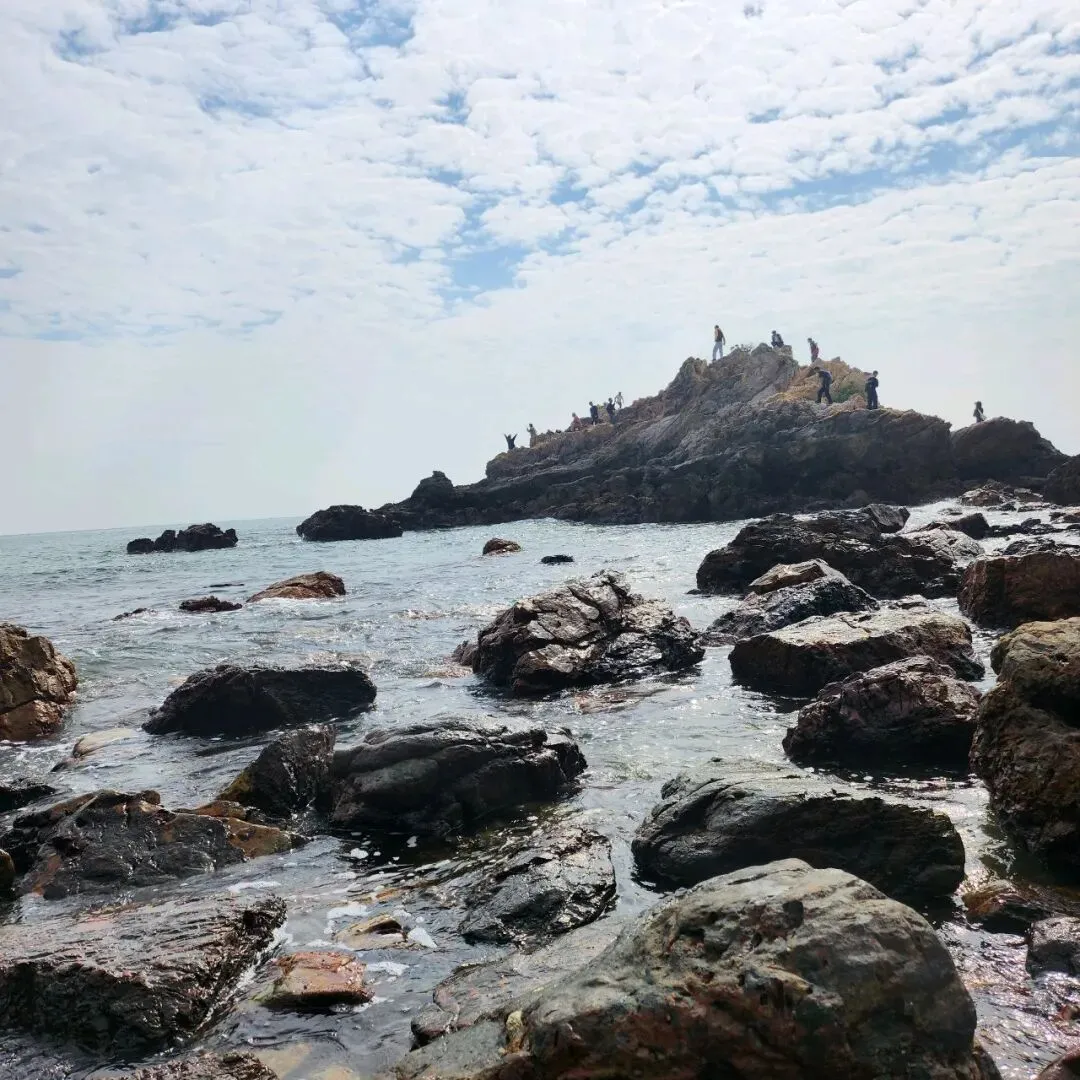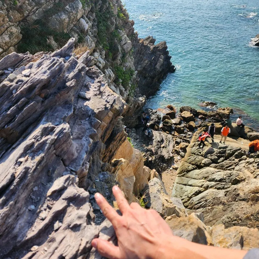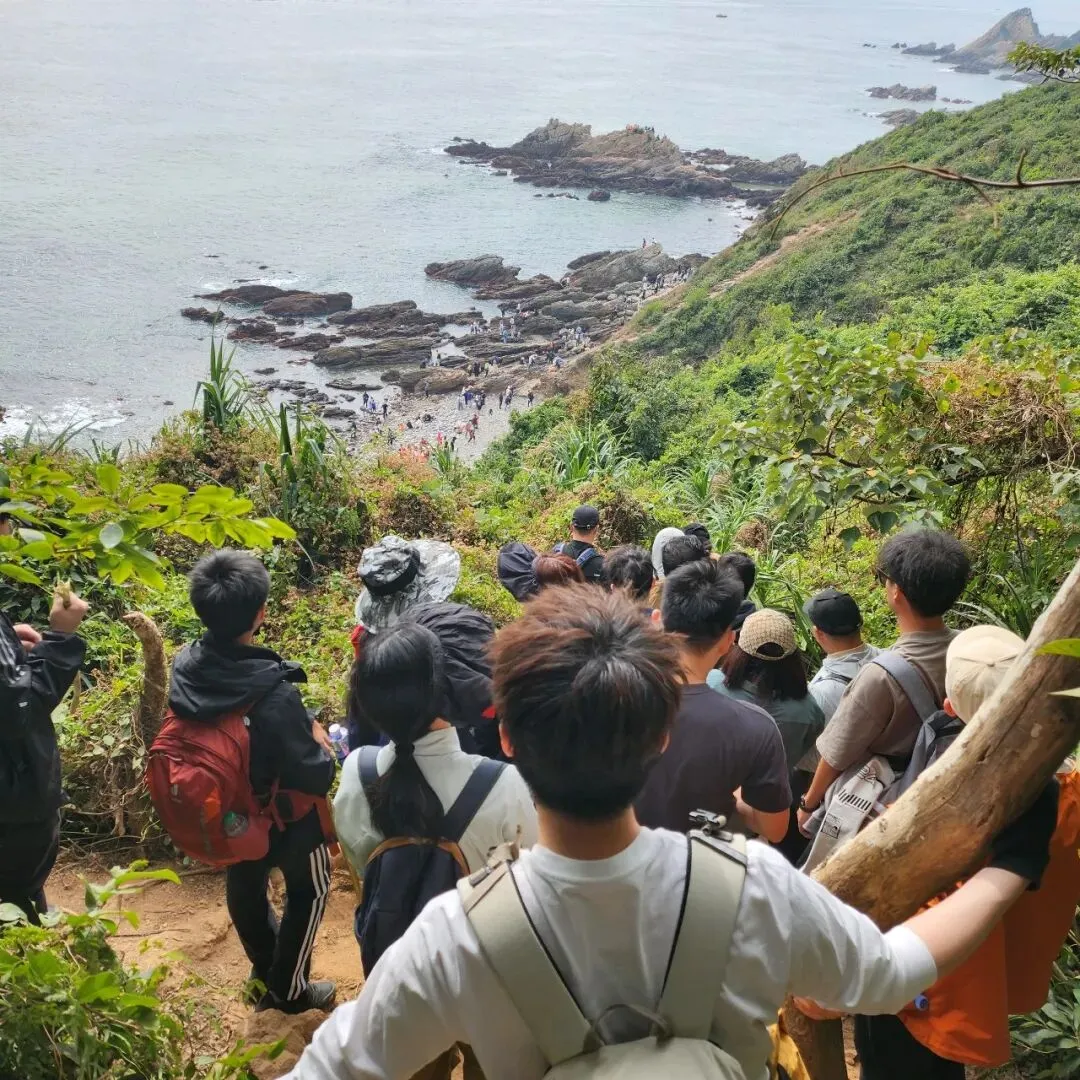 从东涌社区工作站处,经过一条浅水小河,过桥后绕着一个静水湖(实在不知道叫什么湖)一圈随即进入山路,走1公里左右,一直走到下陡坡的路段就差不多到了海岸线入口。如果是周六日过来玩,完全不用考虑懂不懂路的问题,这个线路已非常成熟,跟着人流走,不会错到哪里去,下海岸的那一小段路口非常窄,不能同时大量的过人,这里要尽可能的小心,没站好打滑的话必定是人仰马翻的,人多得几乎要排队15分钟,非常夸张;这里拍上一张,随手一拍,图片就色彩斑斓。