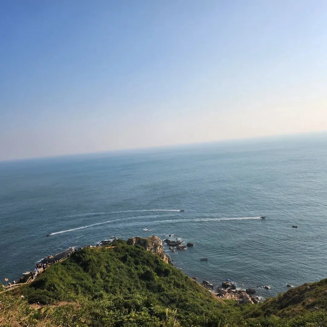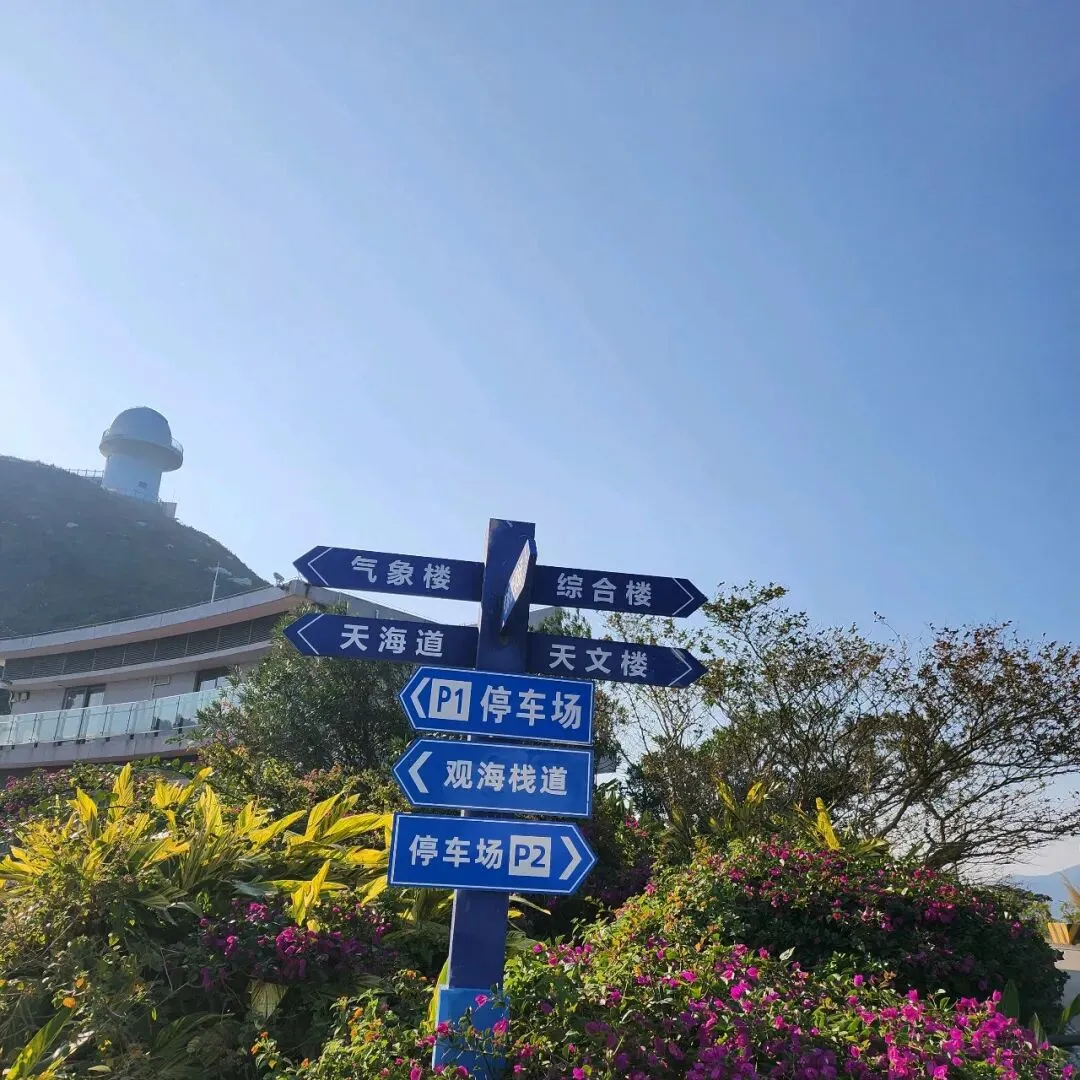 约3-4公里路程的时候,会途经天文台,不过,如果你没有提前预约,是无法进入参观的。在外面观摩一下气象设备也算赚到了,这个路线设计的非常不错,紧接往观海栈道方向走,这里的风景真是太壮观了,碧海蓝天、游轮、夕阳、山体结合,所有的思绪都可以在此情此景清空,这里可以顺着逆光拍上几张;拍完,顺着阶梯往下走个7-800米又可以绕回穿越路线。