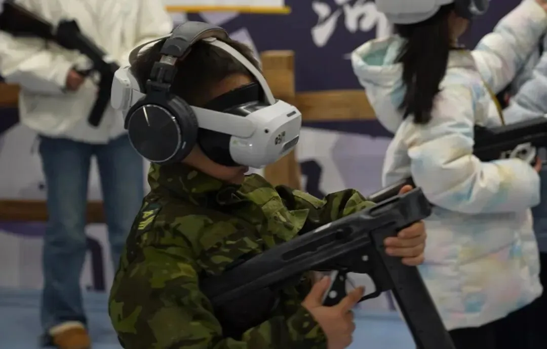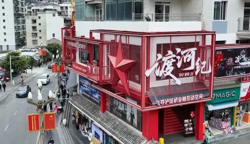 在泸定桥东桥头附近,新开放的"渡河纪"VR体验中心,来自成都的黄锦仁小朋友正在工作人员的指导下佩戴VR设备。"渡河纪"VR体验项目通过虚拟现实技术,结合360度全景画面、动态平台模拟和多感官特效,再现了当年红军强渡大渡河的历史场景。科技与历史的交融,正在开启红色教育的新篇章,让革命精神在数字时代绽放永恒光芒。