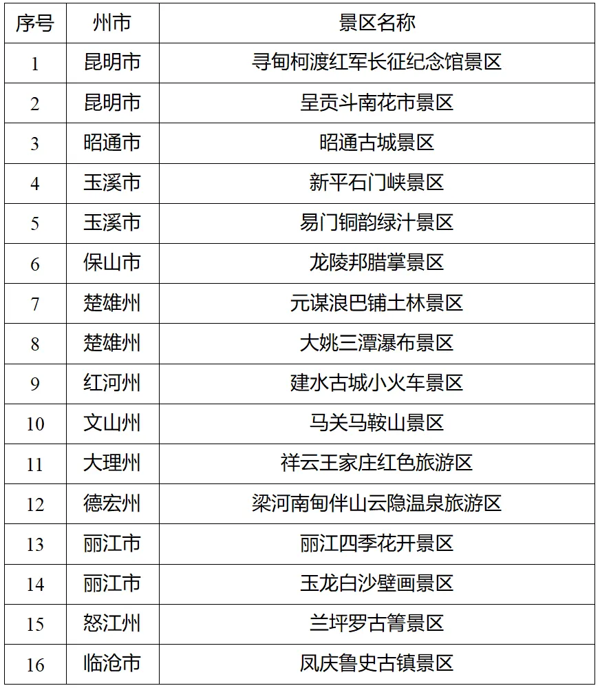 根据《旅游景区质量等级划分》(GB/T 17775-2024)国家标准和《旅游景区质量等级管理办法》要求,经各州(市)文化和旅游局初评、推荐,云南省文化和旅游厅按程序组织开展了2025年国家4A级旅游景区评定工作,寻甸柯渡红军长征纪念馆景区等16家景区达到国家4A级旅游景区标准,拟确定为国家4A级旅游景区。
