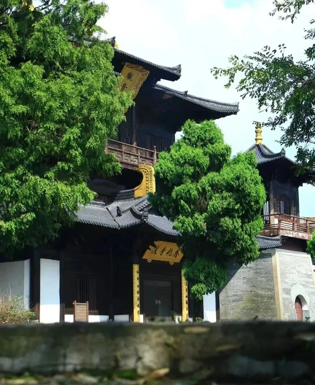 佛迹寺因观音菩萨在此留下左脚印的佛迹而建,享有“要去普陀山,先到达蓬山”的美誉。