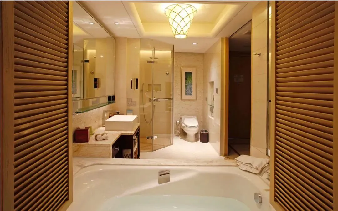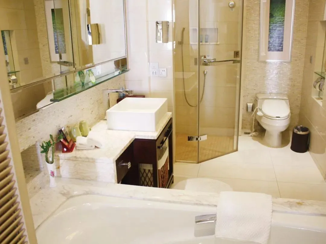 带孩子入住的话,可以让酒店客房部准备儿童拖鞋、牙刷和浴袍,卫生间干湿分离,大浴缸、淋浴都有,还提供浴盐。